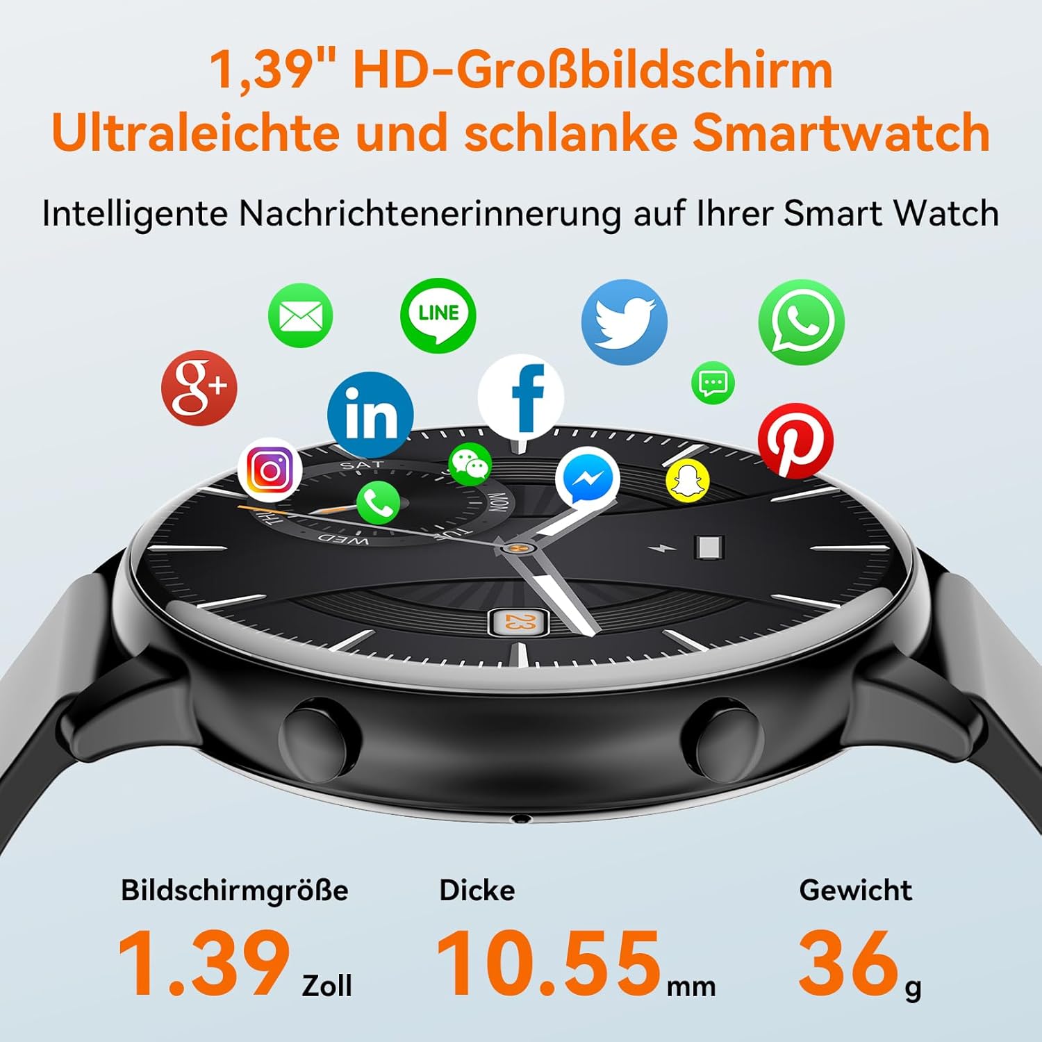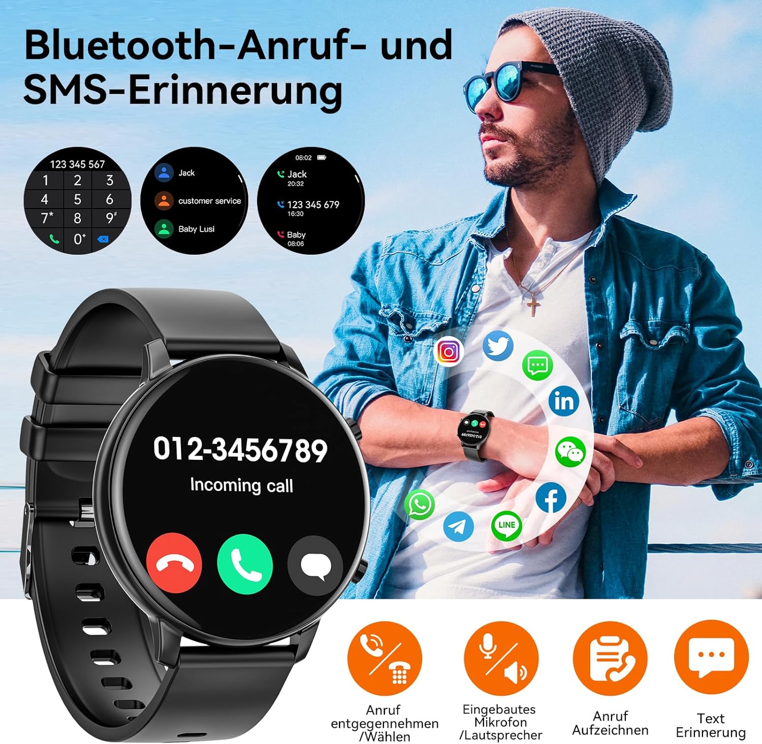 • Bluetooth обаждане, интелигентни известия: смарт часовник за мъже и жени, кръгъл, поддържа Bluetooth известия за обаждания и писма. Позволява ви да преглеждате историята на обажданията, да добавяте обикновени контакти и да улеснявате телефонните разговори. В същото време, той поддържа и известия и напомняния от популярни социални мрежи като Facebook, WhatsApp и др. и ви позволява да бъдете по-фокусирани и продуктивни, когато спортувате или работите.