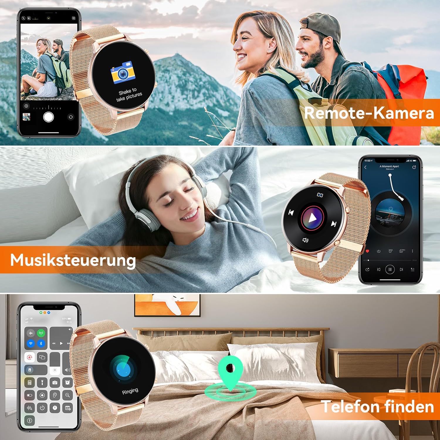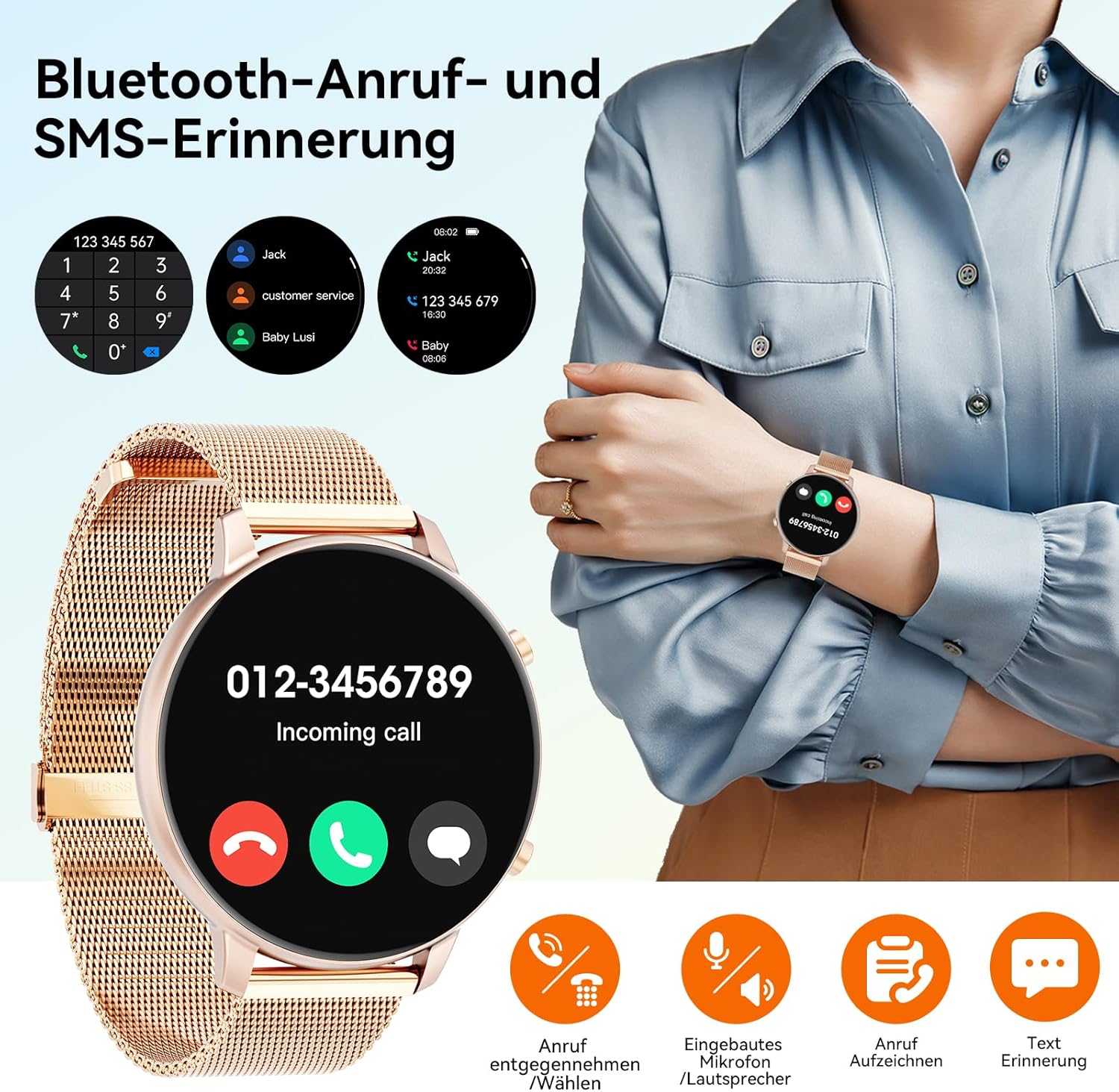 • Bluetooth обаждане, интелигентни известия: смарт часовник за мъже и жени, кръгъл, поддържа Bluetooth известия за обаждания и писма. Позволява ви да преглеждате историята на обажданията, да добавяте обикновени контакти и да улеснявате телефонните разговори. В същото време, той поддържа и известия и напомняния от популярни социални мрежи като Facebook, WhatsApp и др. и ви позволява да бъдете по-фокусирани и продуктивни, когато спортувате или работите.