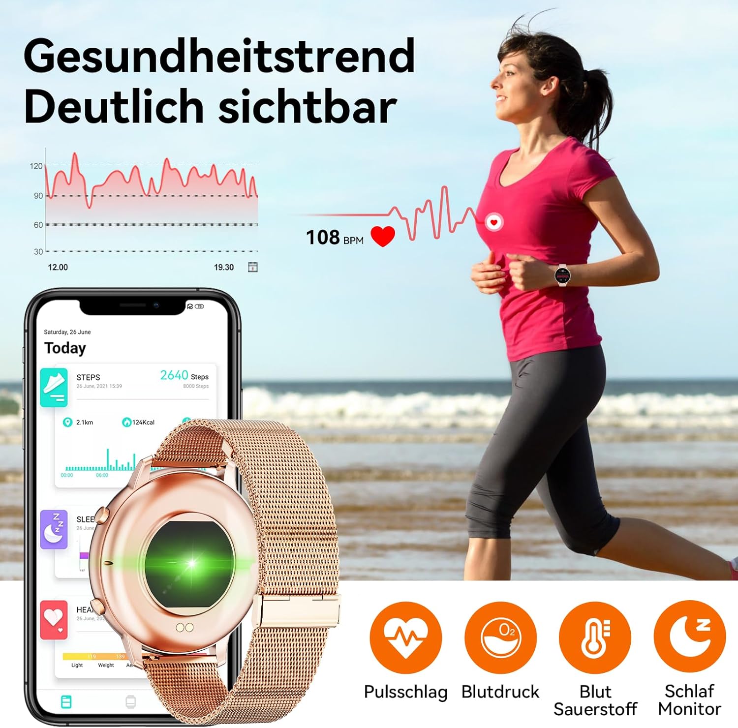 • 24/7 Мониторинг на здравето Този смарт часовник за жени и мъже е оборудван със сензор за сърдечен ритъм, комбиниран с високотехнологична измервателна технология, за наблюдение на динамичния сърдечен ритъм в реално време. Автоматично наблюдение и записване на продължителността и фазите на съня. Всички данни могат да бъдат анализирани синхронно с вашия телефон, допринасяйки за по-здравословен начин на живот.