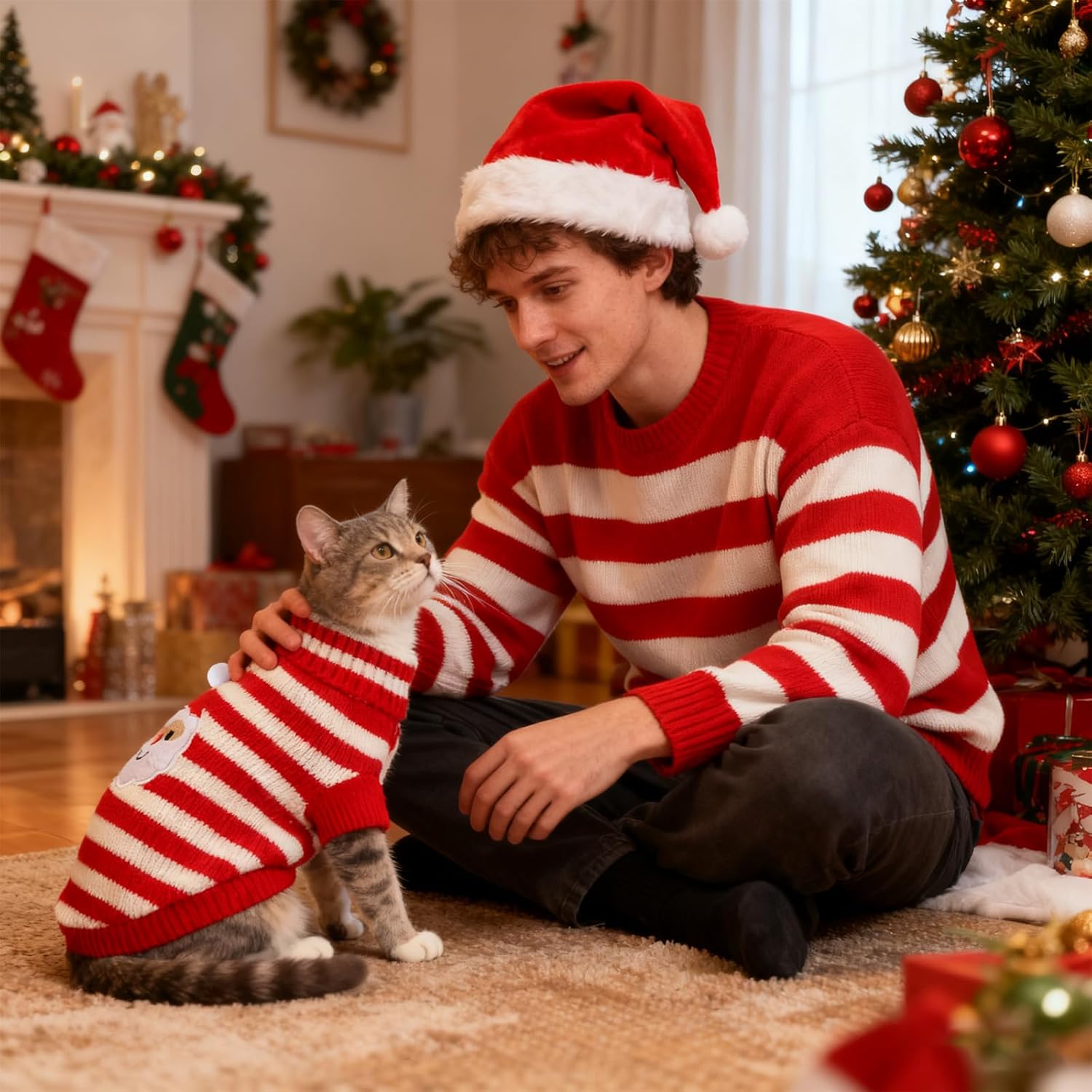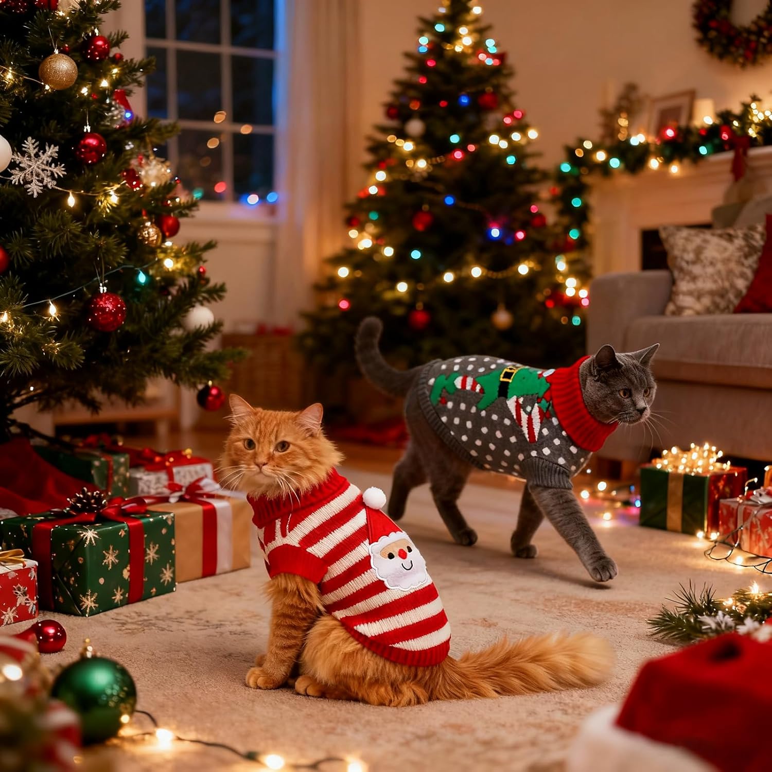 HYLYUN Комплект от 2 коледни пуловера с котка, топъл пуловер за домашни любимци, плетен пуловер с котка, пуловер с мотив Дядо Коледа и грозна коледна шарка за котенца и малки кучета, XS