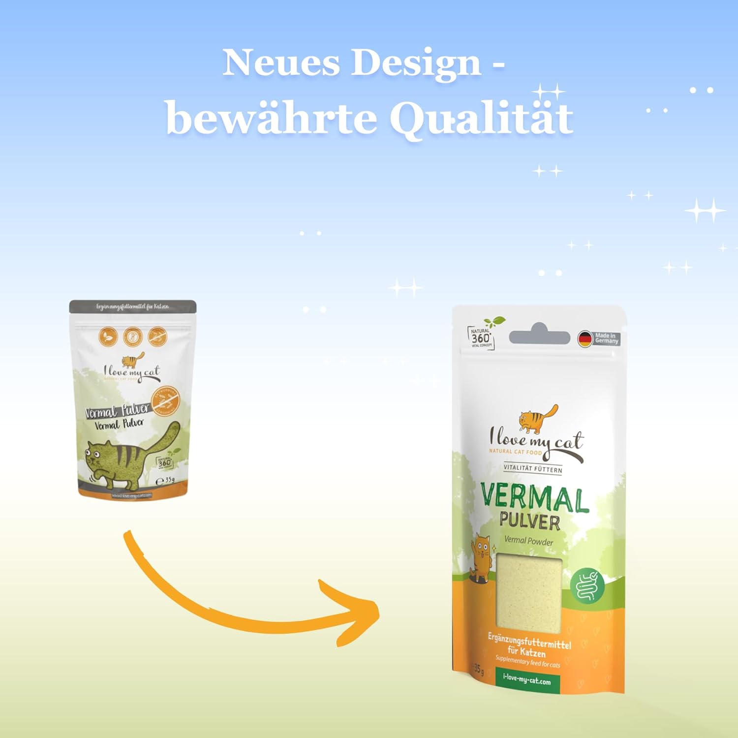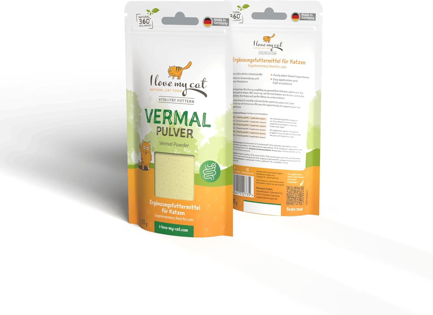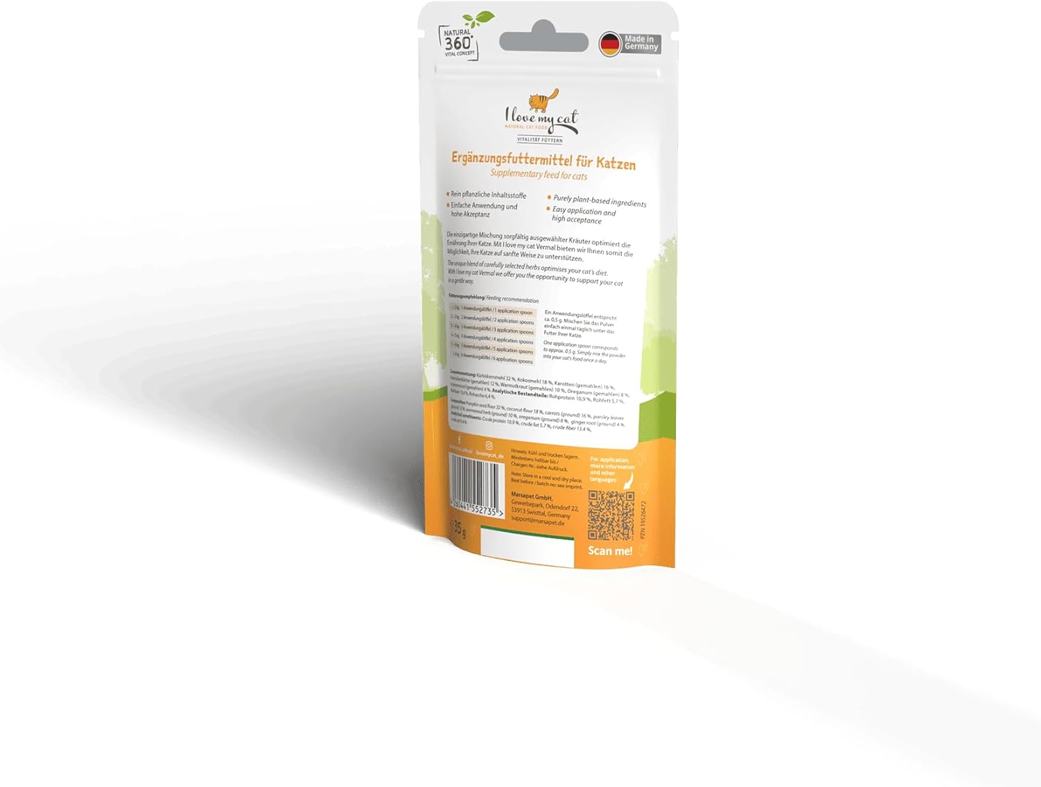 • I Love My Cat Vermal: Тази висококачествена допълнителна храна е разработена в сътрудничество с ветеринарни лекари и съдържа внимателно балансирана, естествена формула, която отговаря на нуждите на котките.