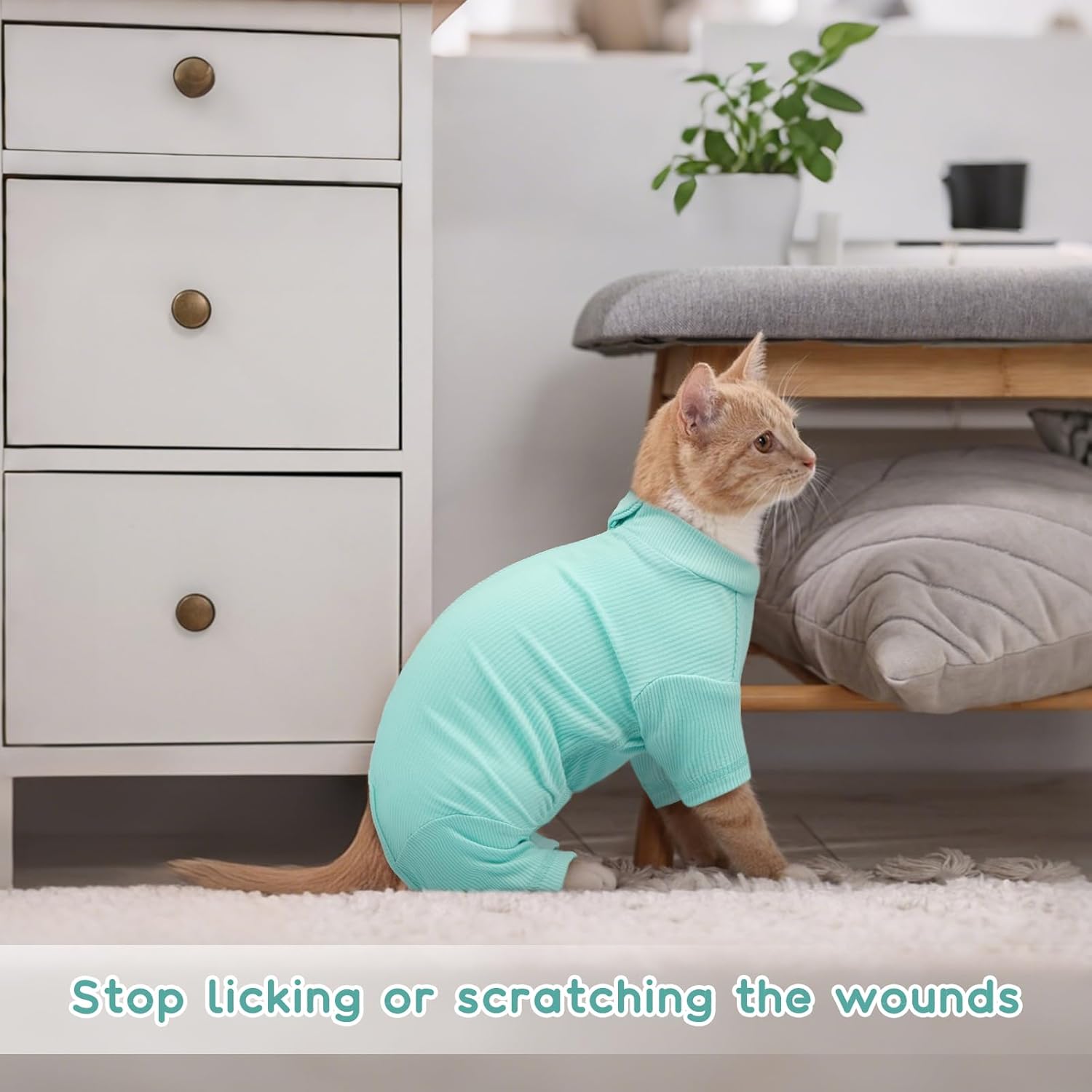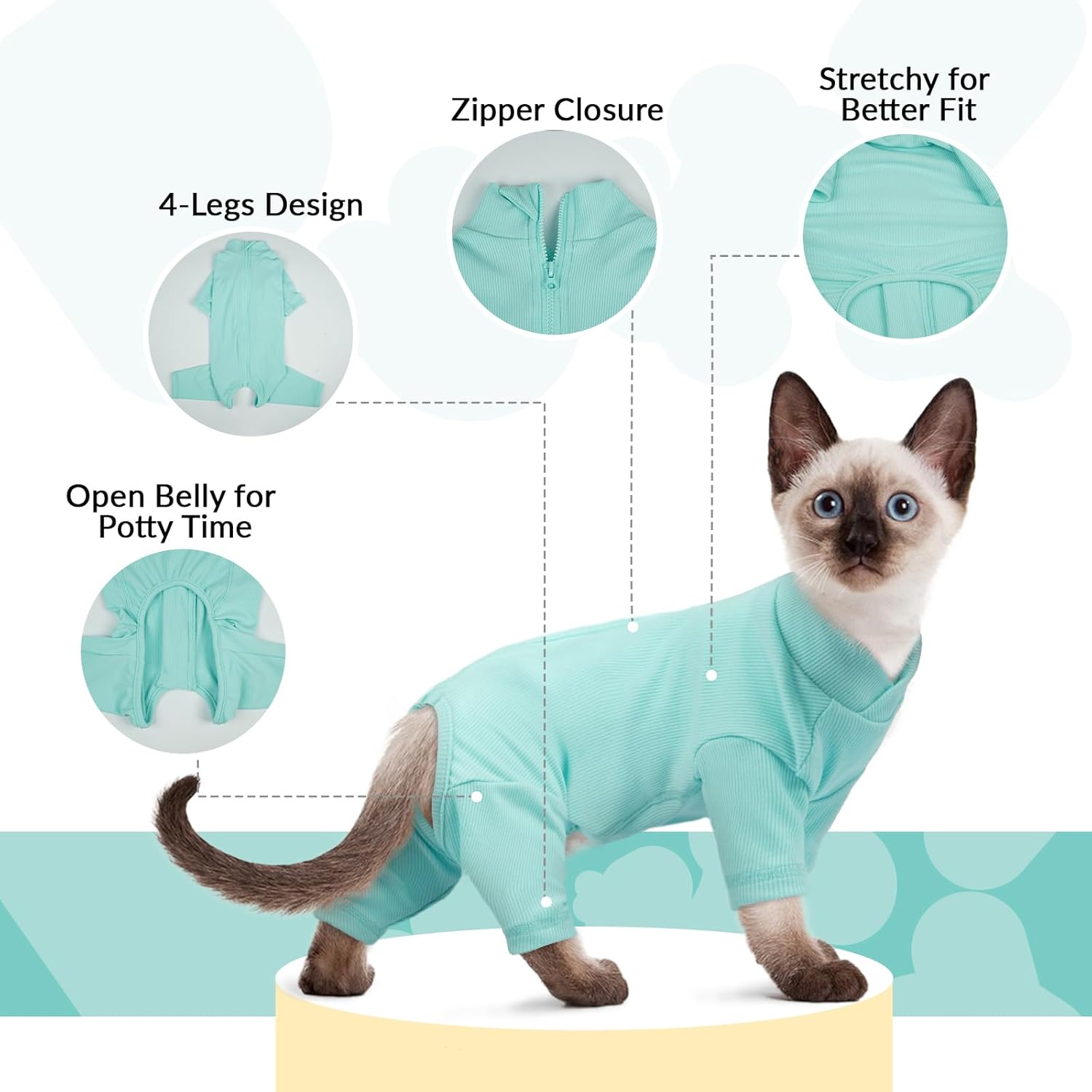• Напълно защитен дизайн Четирикракият дизайн на котешкия гащеризон осигурява цялостна защита, а коремната част на котешката дреха е отворена за лесно прекарване на тоалетна. Той ефективно намалява косопада и държи котешката козина далеч от мебелите. Покрива рани, за да предотврати облизването им (Забележка: голям отвор на корема, не е подходящ като котешки гащеризон след кастрация или за покриване на коремни рани).