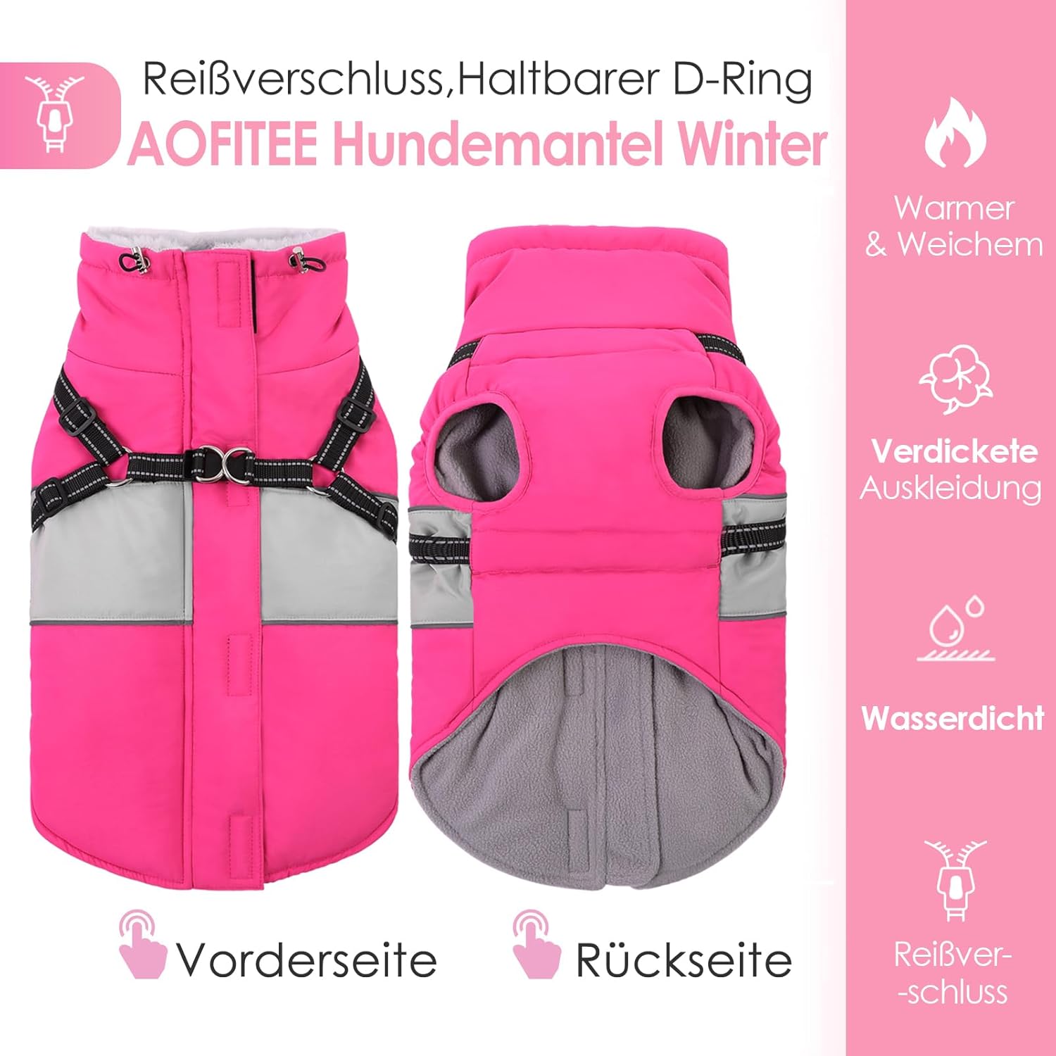 Яке за кучета AOFITEE за средни породи кучета, зимно водоустойчиво яке за кучета, палто за кучета с хамута, топло зимно палто, отразяващо зимно облекло за кучета на открито за дакел, бостън териер, розово M