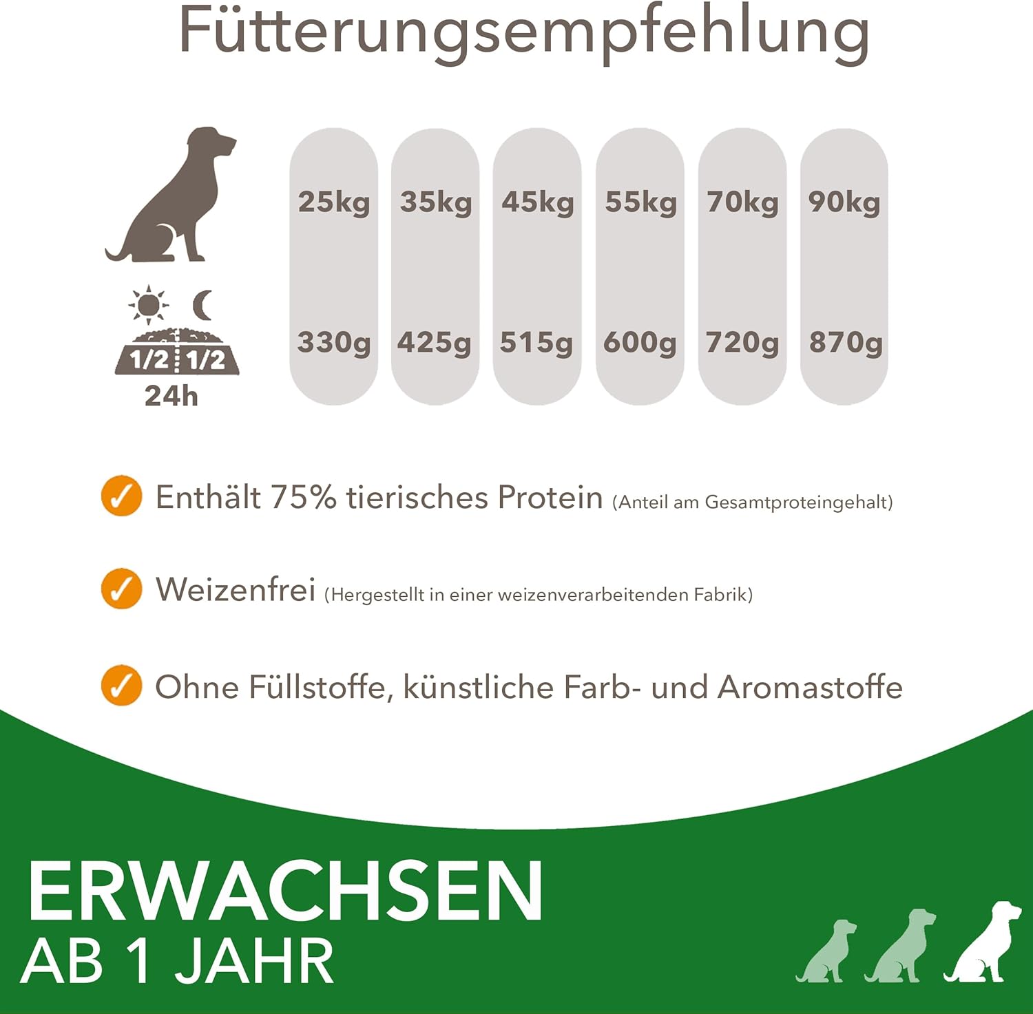 Състав: Сушено пилешко и пуешко месо 29% (включително пилешко 18%), ечемик, царевица, свинска мас, агнешко месо (4%), сушена цвеклова каша (2,5%), пилешки сос, минерали (съдържа натриев хексаметафосфат 0,35%), ленено семе, фруктоолигозахариди (0,2%), сушена бирена мая. Аналитични съставки: Протеин: 26%, Съдържание на мазнини: 15%, Омега-6 мастни киселини: 1,6%, Омега-3 мастни киселини: 0,2%, Сурова пепел: 6,7%, Сурови фибри: 2,6%, Калций: 1,5%, Фосфор: 1,1%. Добавки: ^(/кг), Витамини: Витамин А: 23 000 IU, Витамин D3: 1 100 IU, Витамин Е: 135 мг. Микроелементи: Мед (меден(II) сулфат пентахидрат): 13 mg, Йод (йод като калиев йодид): 2.6 mg, Желязо (железен(II) сулфат монохидрат): 69 mg, Манган (манганов сулфат монохидрат): 40 mg, Цинк (цинков оксид): 115 mg, Селен (натриев селенит): 0.08 mg. ^Количества, налични към момента на производство.
