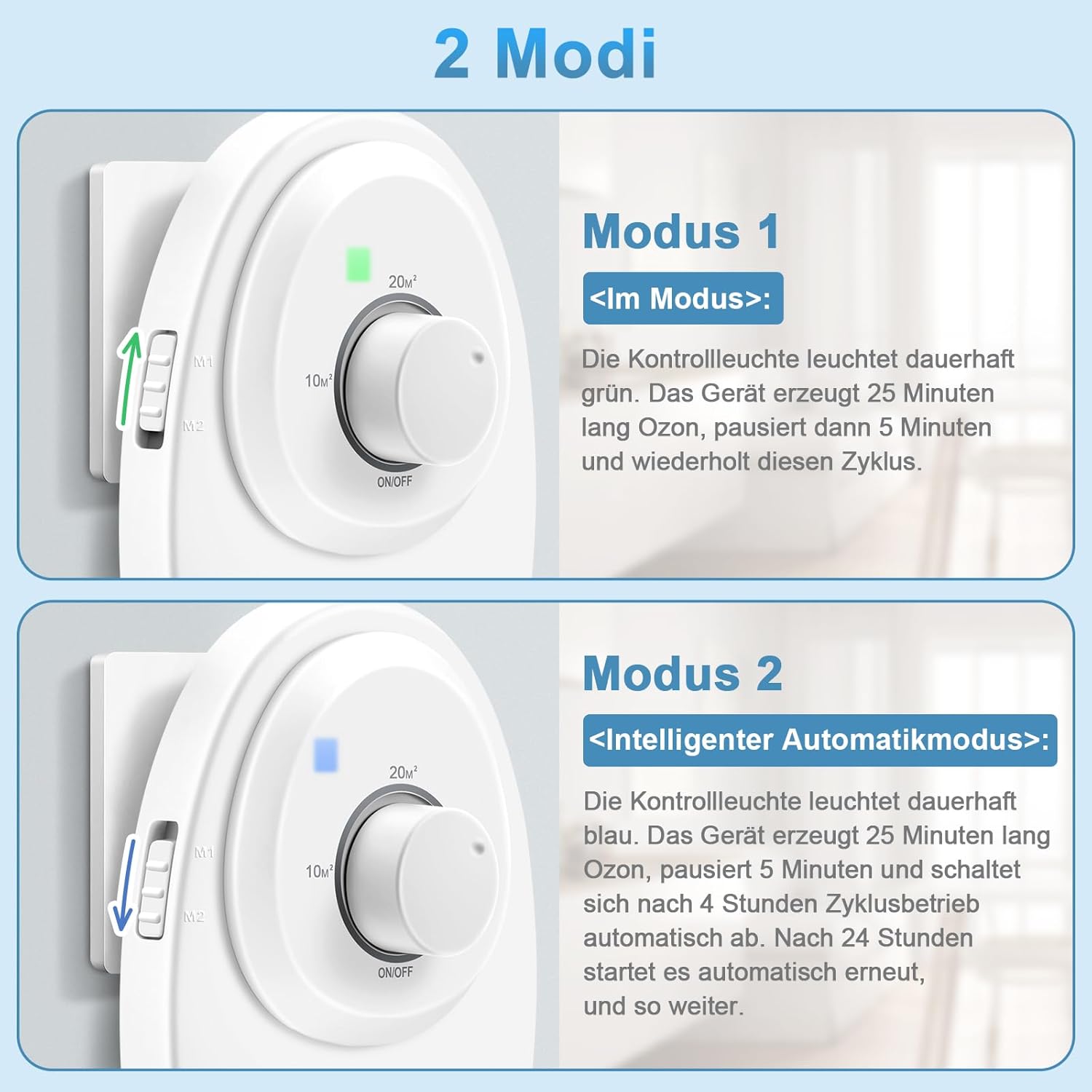 • Област на употреба и 4 режима: Генератор на озон, подходящ за почистване на помещения с площ 5-30㎡. Можете да регулирате според размера на помещението си. Включете устройството, натиснете бутона "Вкл./Изкл.", включете и изключете устройството, индикаторът за режим мига, за да покаже, че устройството работи, и ако индикаторът за режим свети постоянно, това е състояние на готовност на устройството. Натиснете бутона "Режим", когато е включено, за да изберете режим на цикъл P1, P2, P3, P4.