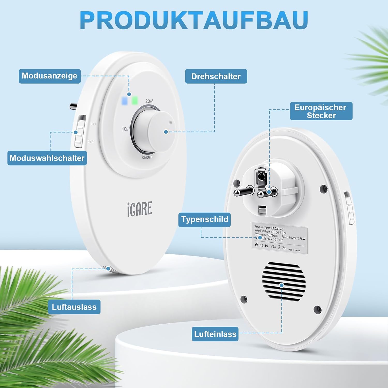 • Не е необходим филтър и спестява пари: просто включете щепсела в захранването, може да произвежда озон и отрицателни йони, не е необходимо да сменяте филтъра. Подходящ за малки пространства в много случаи, като спални, кухни, перални, бебешки стаи, стаи за домашни любимци, бани, хотели, домове, гардероби. Дезодориращата и дезинфекцираща машина е много малка и лека и е много лесна за инсталиране. Красиво опакована и готова за подарък.