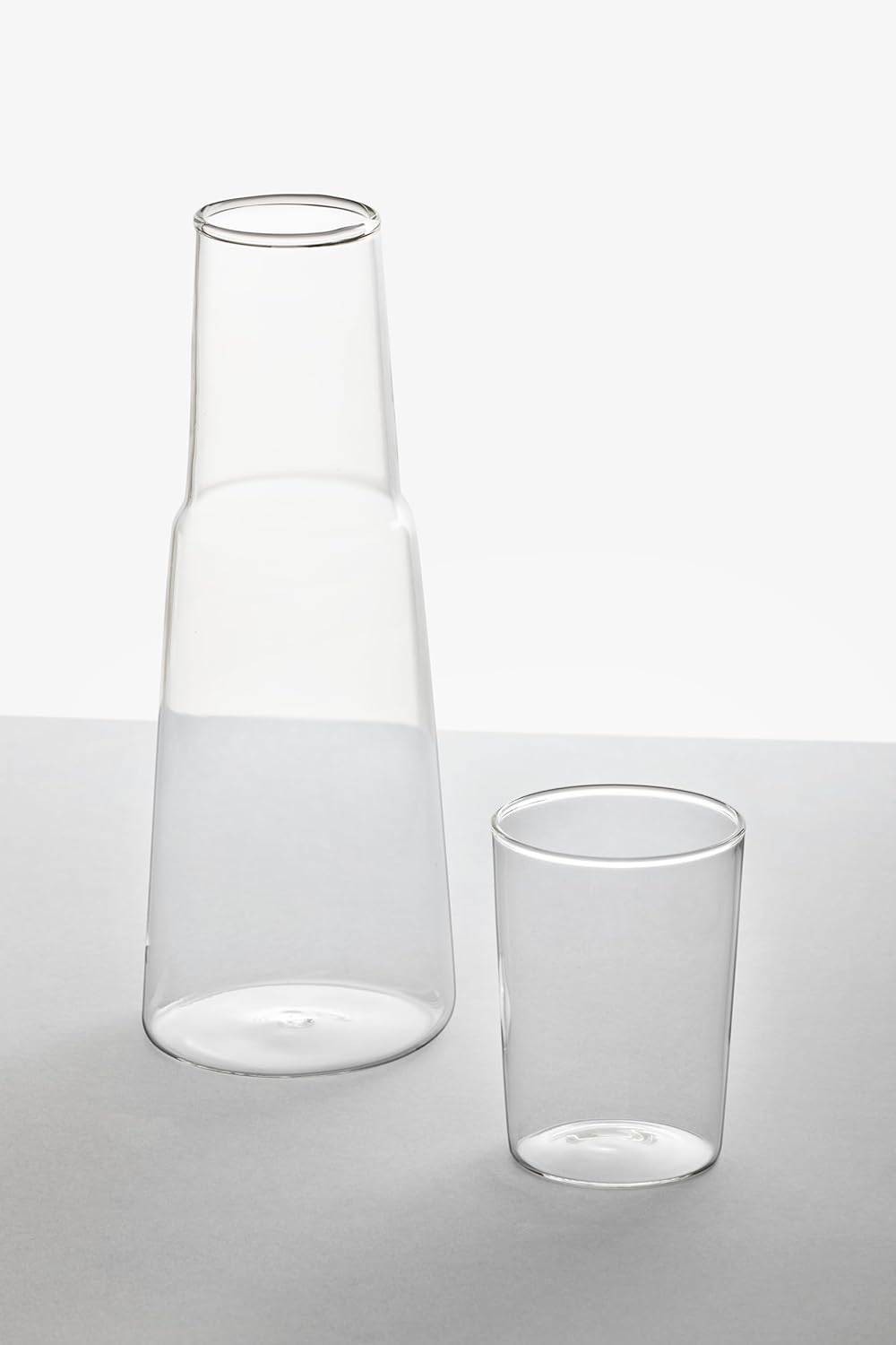 Ръчно изработен комплект от боросиликатно стъкло с форма на лумен, състоящ се от бутилка и прозрачно стъкло. Дизайн от Лина Дони.