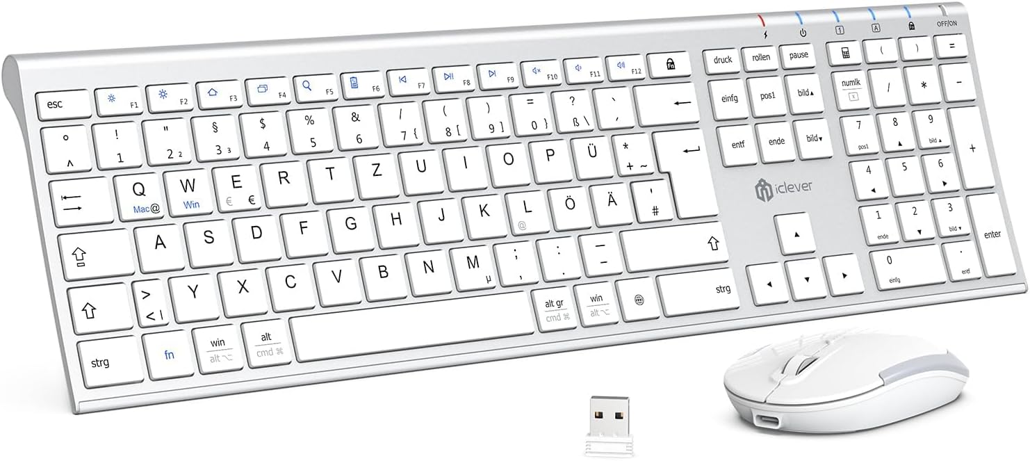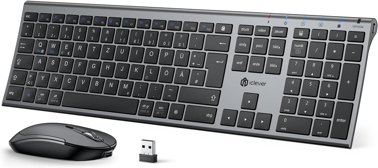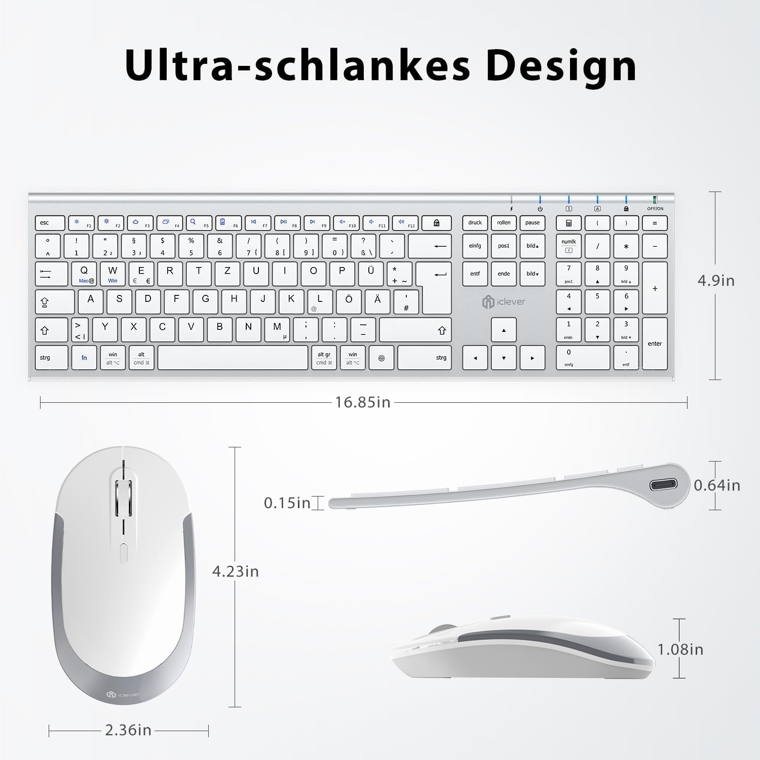 • 【Издръжливи и изящни】Безжичната клавиатура и мишка iClever са изработени от неръждаема стомана и ABS и имат ъгъл на наклон от 10°. Те позволяват работа без групиране на компютъра, което ги прави идеалният избор за офис употреба. Комплектът клавиатура и мишка iClever предлага изключително удобно и прецизно писане.