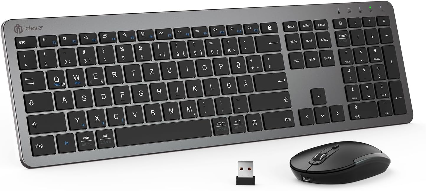 iClever Безжичен комплект клавиатура и мишка, Презареждаща се безжична клавиатура и мишка, Немска QWERTZ подредба, 2.4 GHz Безжична клавиатура и мишка за компютър/лаптоп/смарт телевизор, Бял