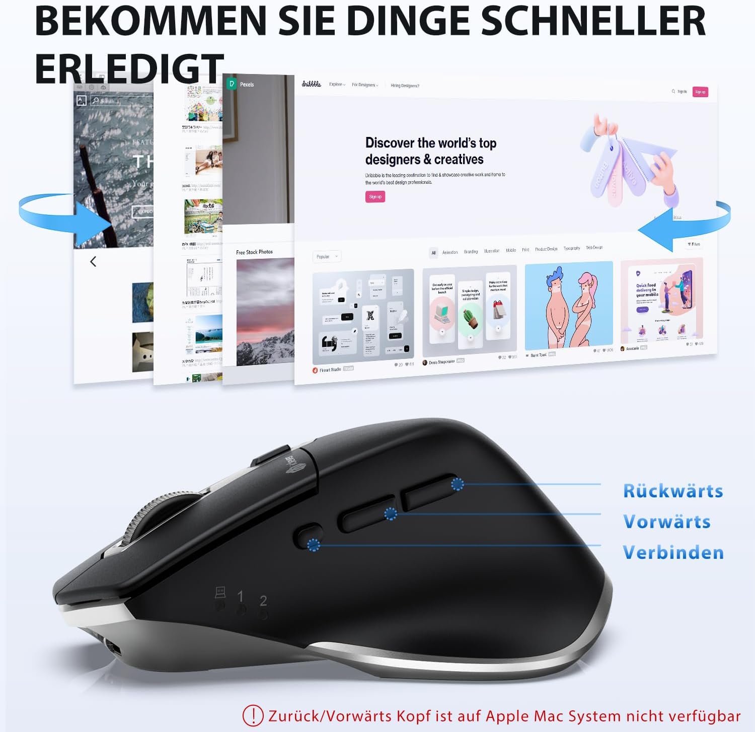 • Тройна свързаност и множество възможности за съвместимост: Благодарение на двойния Bluetooth режим и 2.4G безжичната технология, безжичната компютърна мишка може да се свърже едновременно с до 3 устройства, като например Windows 7/8/10, Mac/iMac/iPhone/iPad/таблет/лаптоп/смартфон. С едно просто щракване върху бутона за свързване отстрани можете да превключвате между 3-те устройства.