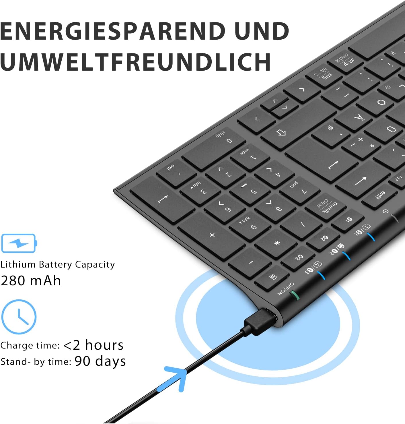 • Дълготрайна батерия и енергийна ефективност: съдържа акумулаторна батерия с до 90 часа работа след едно зареждане. Автоматичен режим на пестене на енергия след 30 минути неактивност - просто натиснете произволен клавиш за 3 секунди, за да активирате отново клавиатурата.