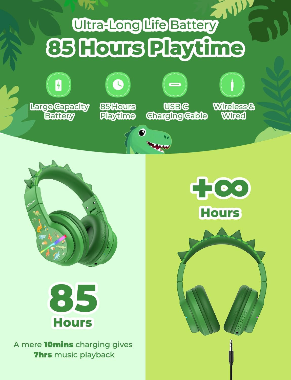 Оставете ги да се забавляват с любимите си мелодии, без да се притеснявате, че ще ви наранят ушите. Бъдете спокойни, защото сте задали едно от 3-те ограничения за силата на звука. Ще се насладите на качеството на звука на 40-милиметровия високоговорител, да не говорим за удобната и издръжлива батерия от 800 mAh. LED светлините, които изобилстват, правят използването и гледането на тези слушалки много по-забавно.