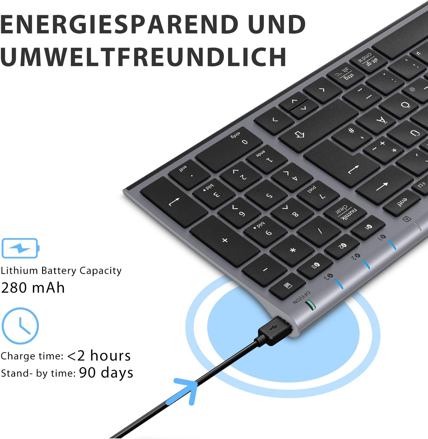 • Дълготрайна батерия и енергийна ефективност: съдържа акумулаторна батерия с до 90 часа работа след едно зареждане. Автоматичен режим на пестене на енергия след 30 минути неактивност - просто натиснете произволен клавиш за 3 секунди, за да активирате отново клавиатурата.
