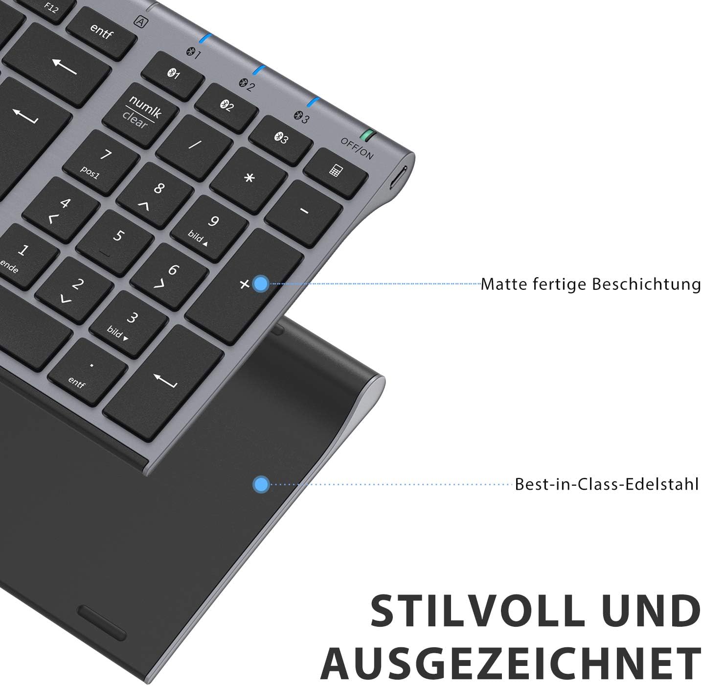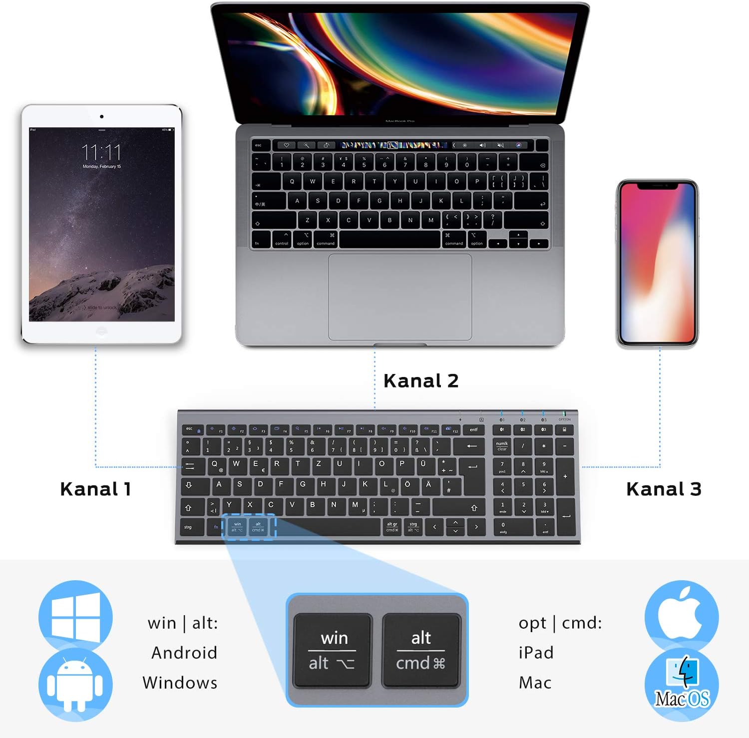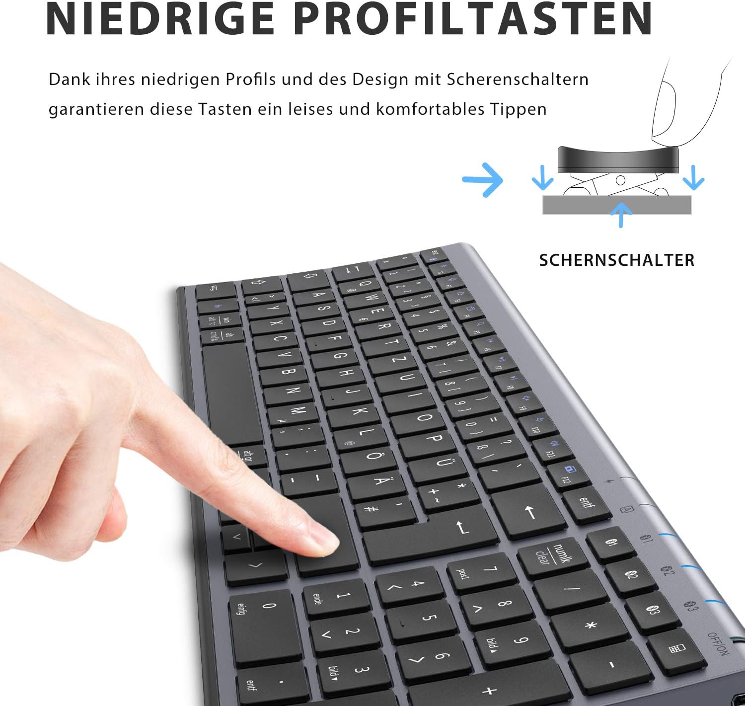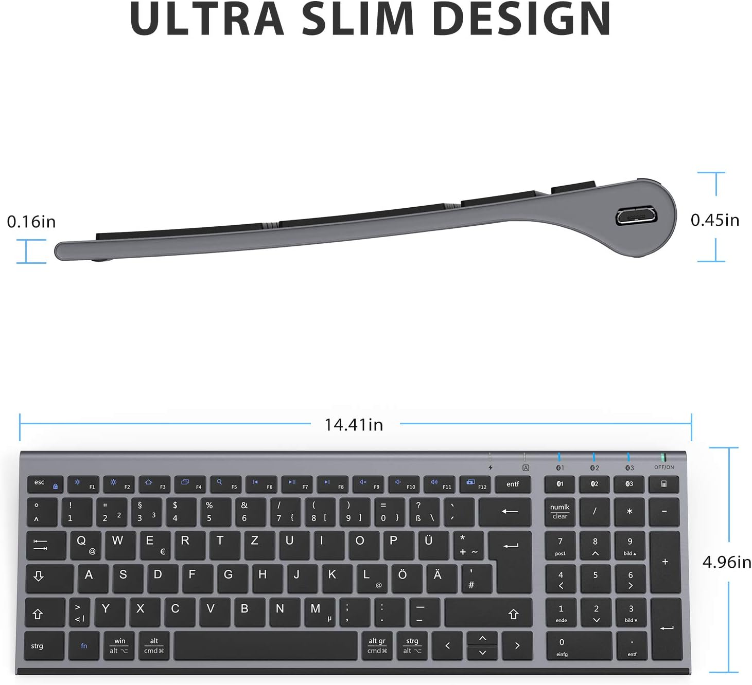 iClever Bluetooth клавиатура, безжични клавиатури с 3 Bluetooth канала, безжична клавиатура с презареждане, за Windows PC/Chrome/Mac - графит, немска QWERTZ подредба