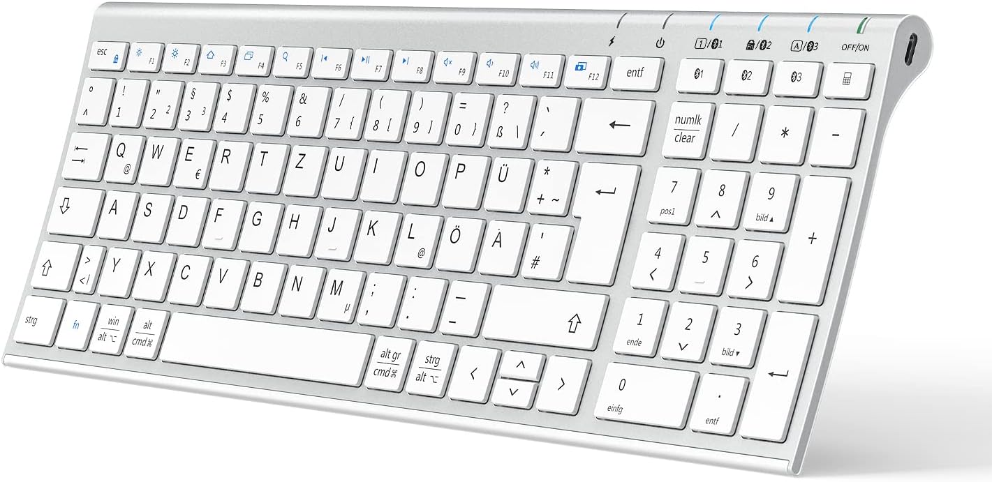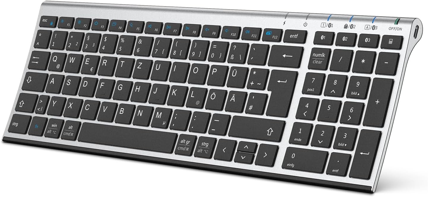 iClever Bluetooth клавиатура, BK10 безжична клавиатура с 3 Bluetooth канала, ултратънка презареждаща се QWERTZ немска безжична клавиатура