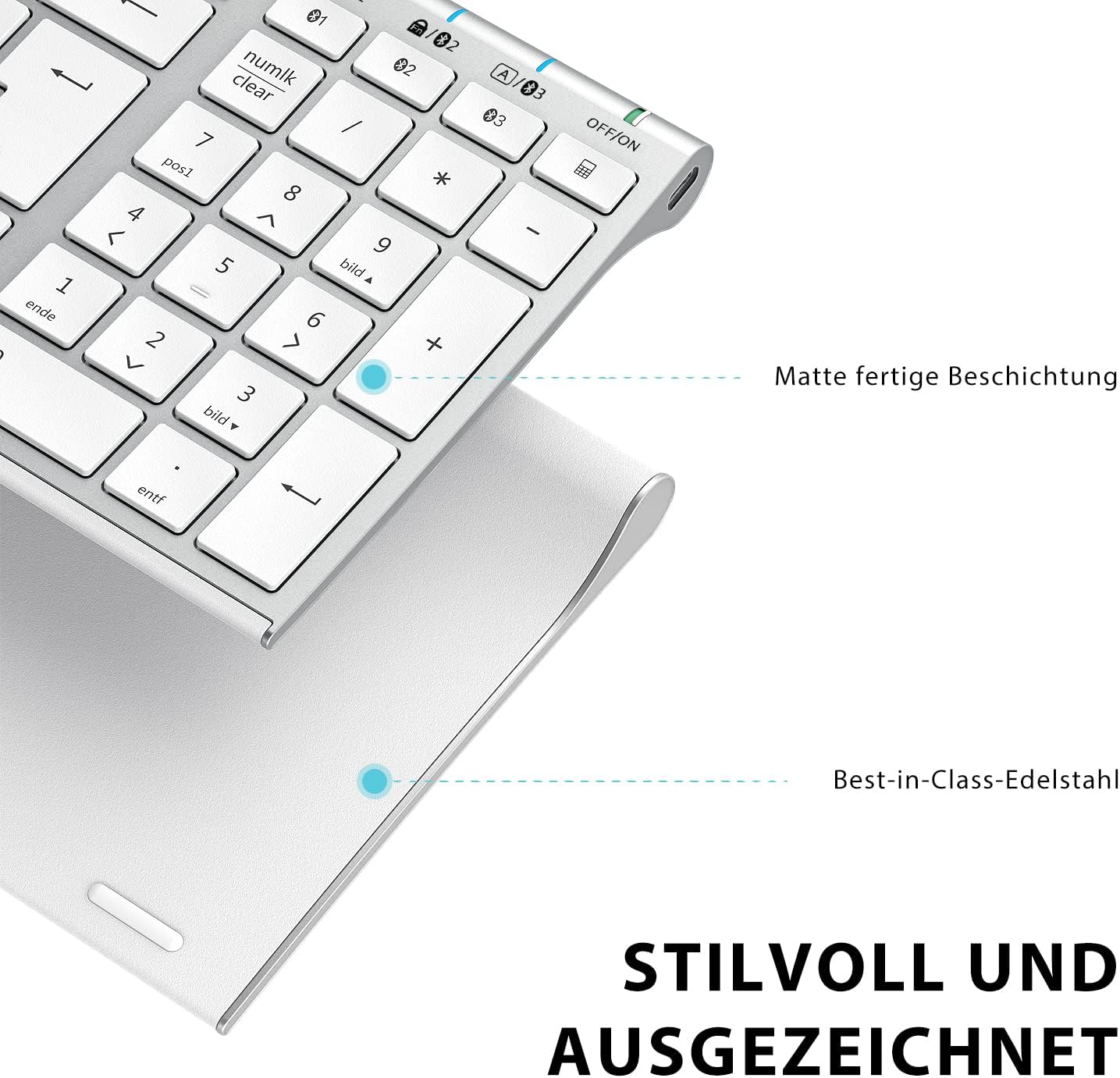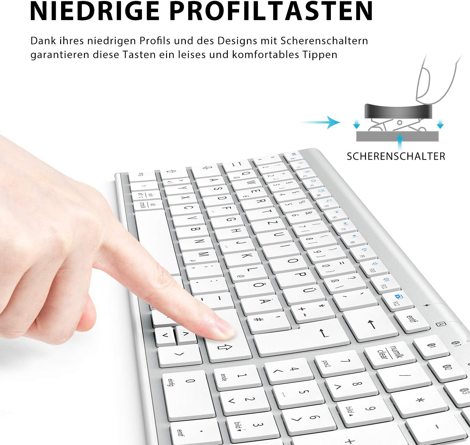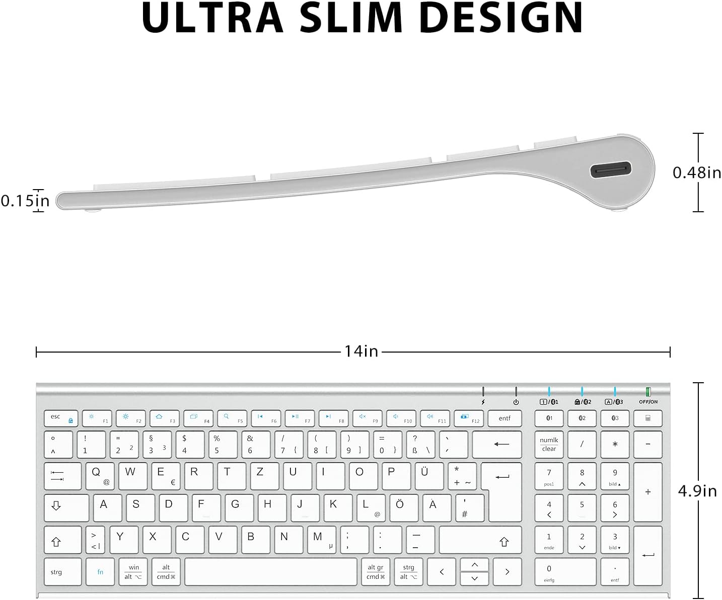 iClever Bluetooth клавиатура, BK10 безжична клавиатура с 3 Bluetooth канала, ултратънка презареждаща се QWERTZ немска безжична клавиатура