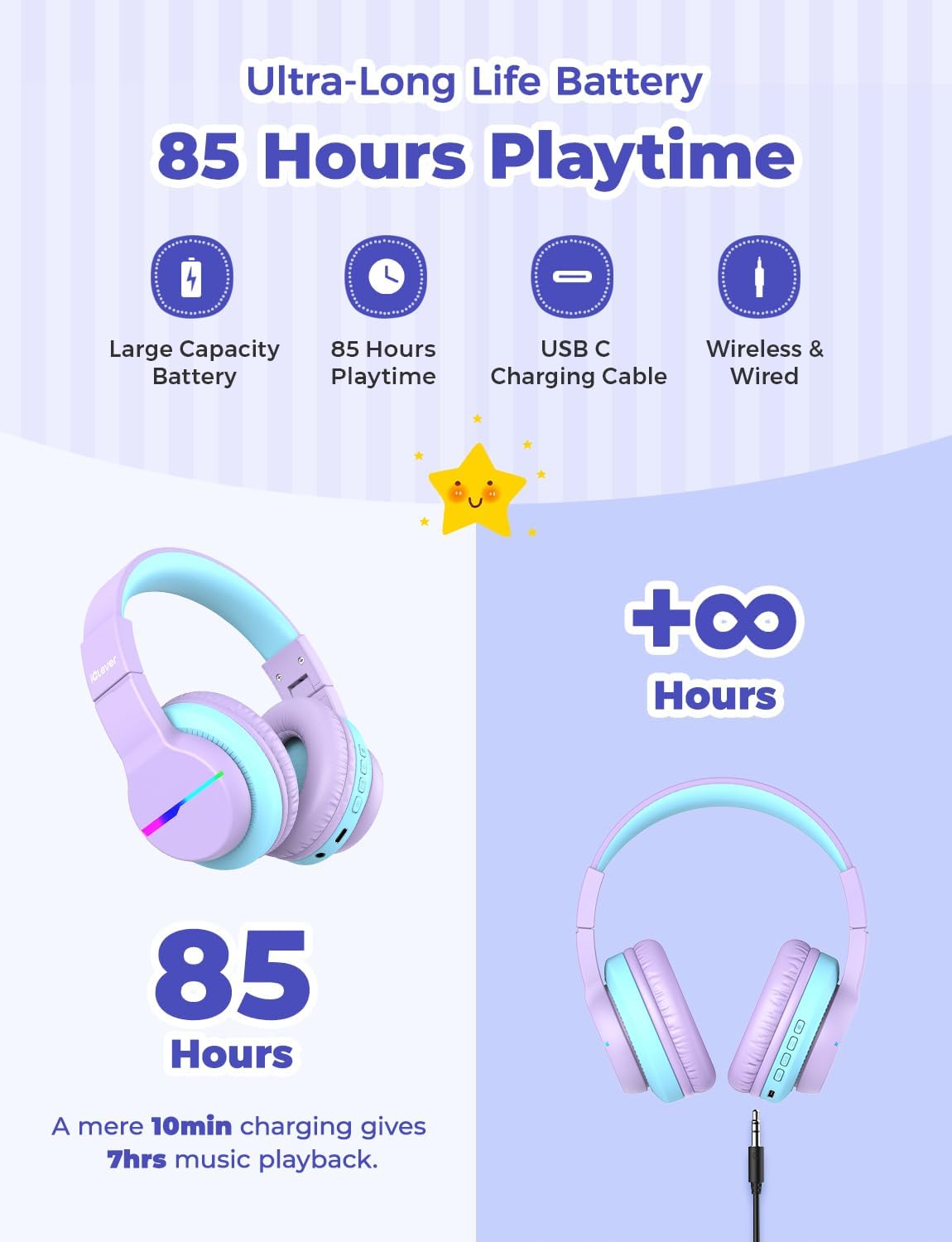 Оставете ги да се забавляват с любимите си мелодии, без да се притеснявате, че ще ви наранят ушите. Бъдете спокойни, защото сте задали едно от 3-те ограничения за силата на звука. Ще се насладите на качеството на звука на 40-милиметровия високоговорител, да не говорим за удобната и издръжлива батерия от 800 mAh. LED светлините, които изобилстват, правят използването и гледането на тези слушалки много по-забавно.