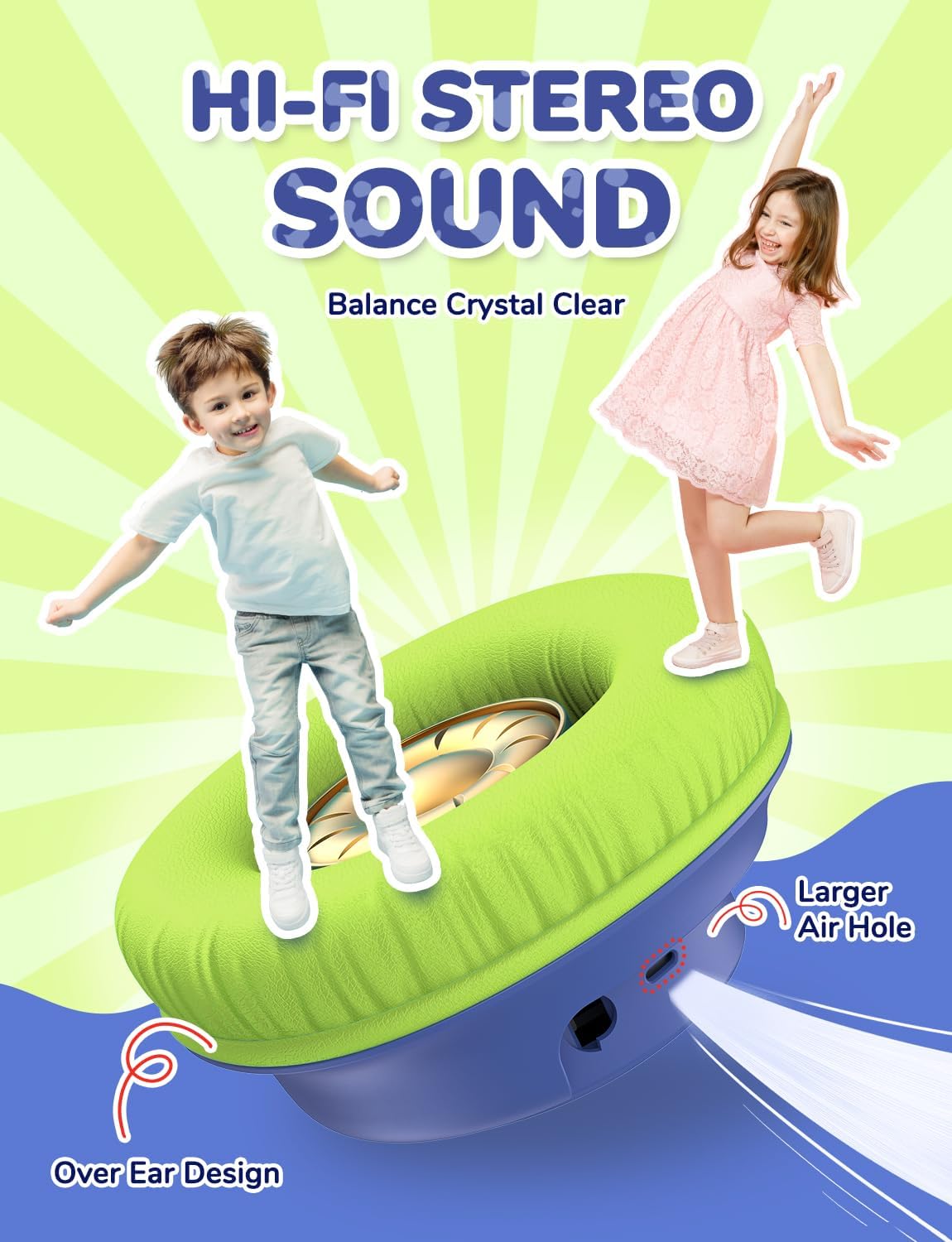 iClever Детски Bluetooth слушалки с LED светлини, ограничение на силата на звука 74/85 dBA, 43 часа време за възпроизвеждане, стерео звук, Type-C, AUX кабел, Bluetooth 5.3 Детски слушалки за таблет/пътуване, синьо-зелени