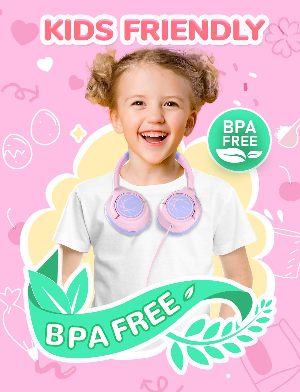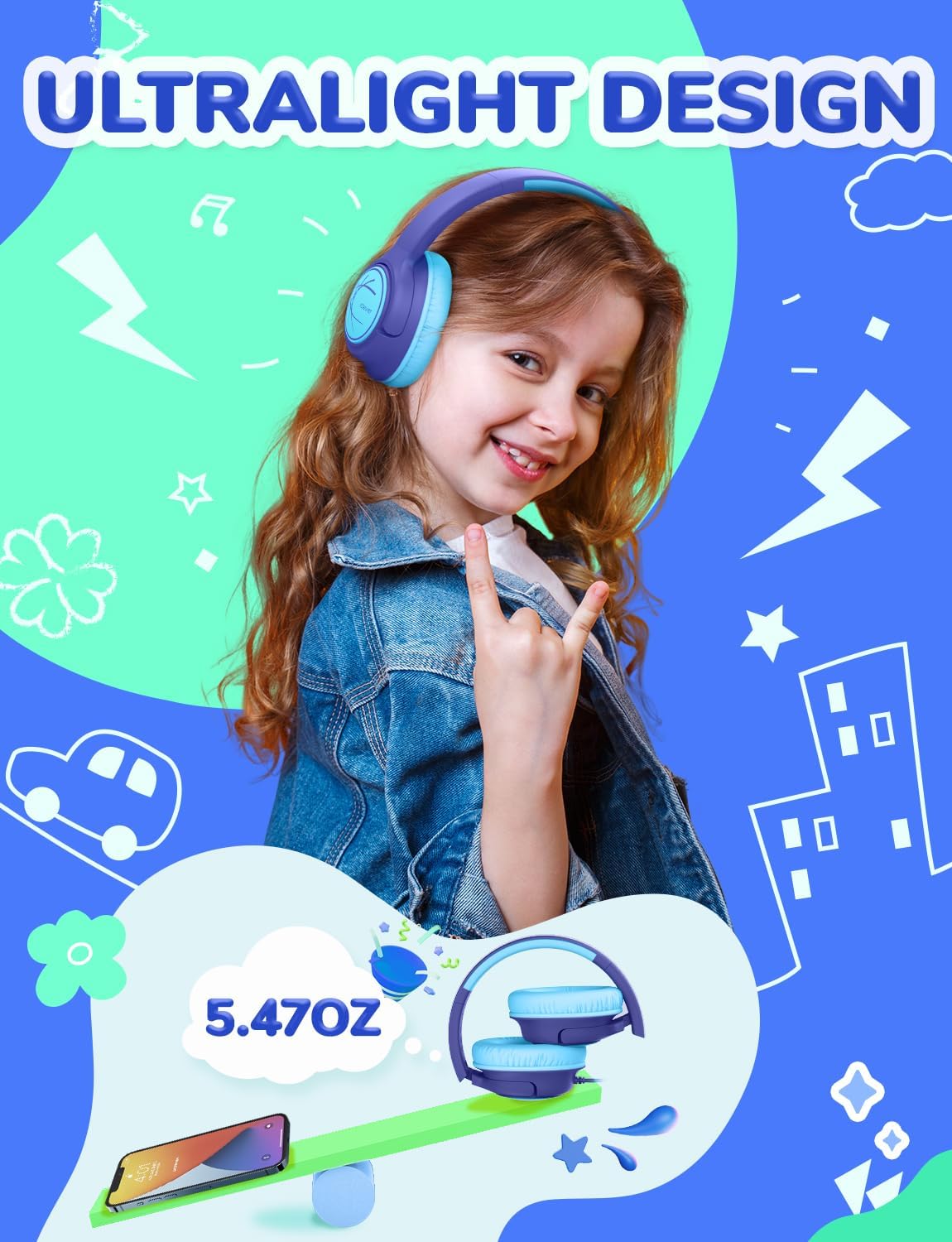 • Ултралек дизайн: Благодарение на теглото си от само 155 г, тези детски слушалки с кабел могат да се носят удобно за дълги периоди от време. А сгъваемият им дизайн позволява лесно съхранение и носене. Тези детски слушалки за училище не съдържат BPA и други вредни материали и следователно са безопасни, устойчиви и подходящи за деца.