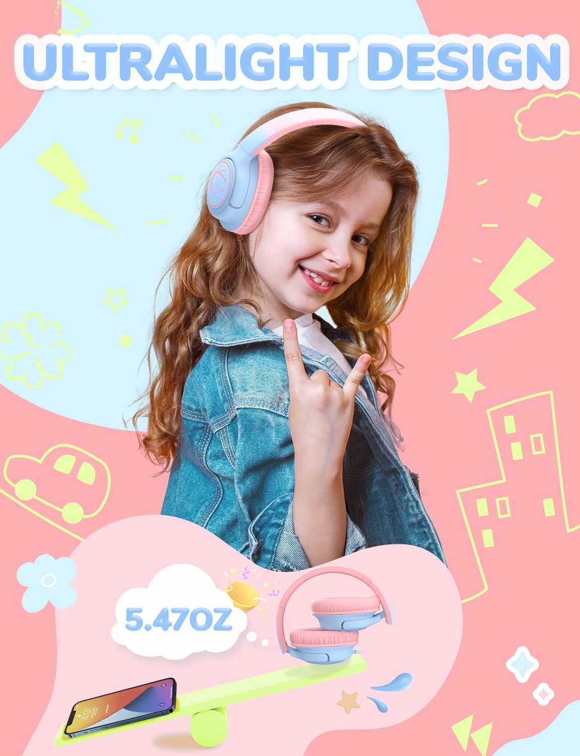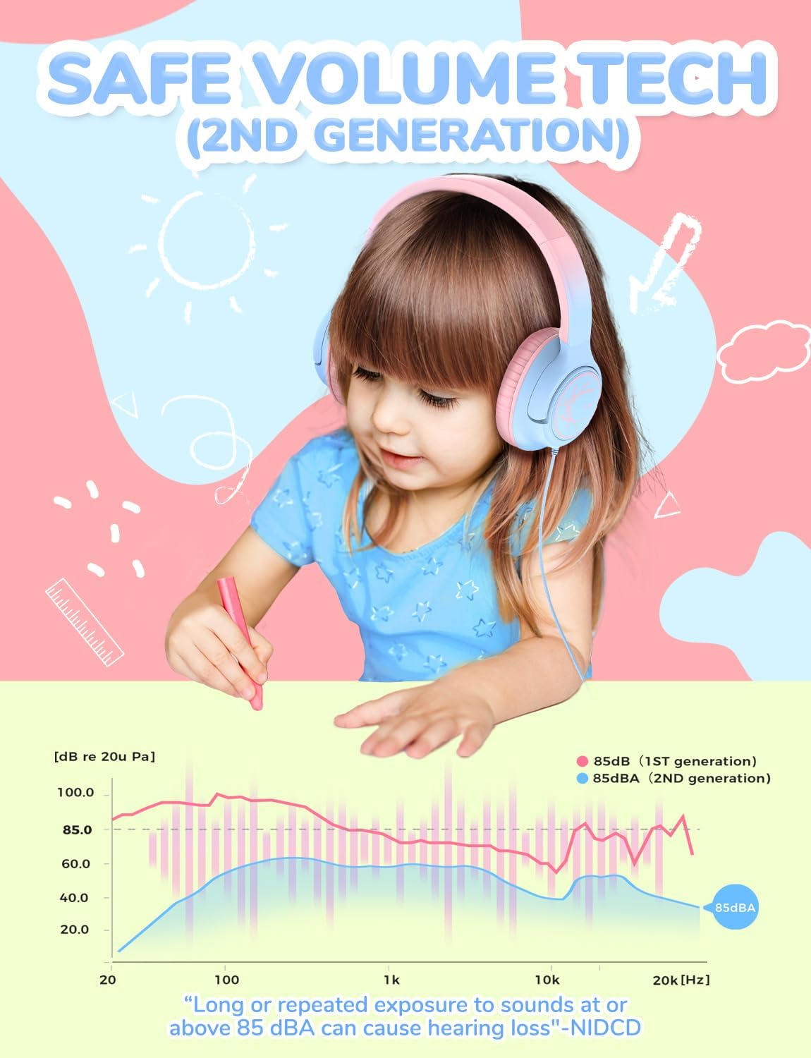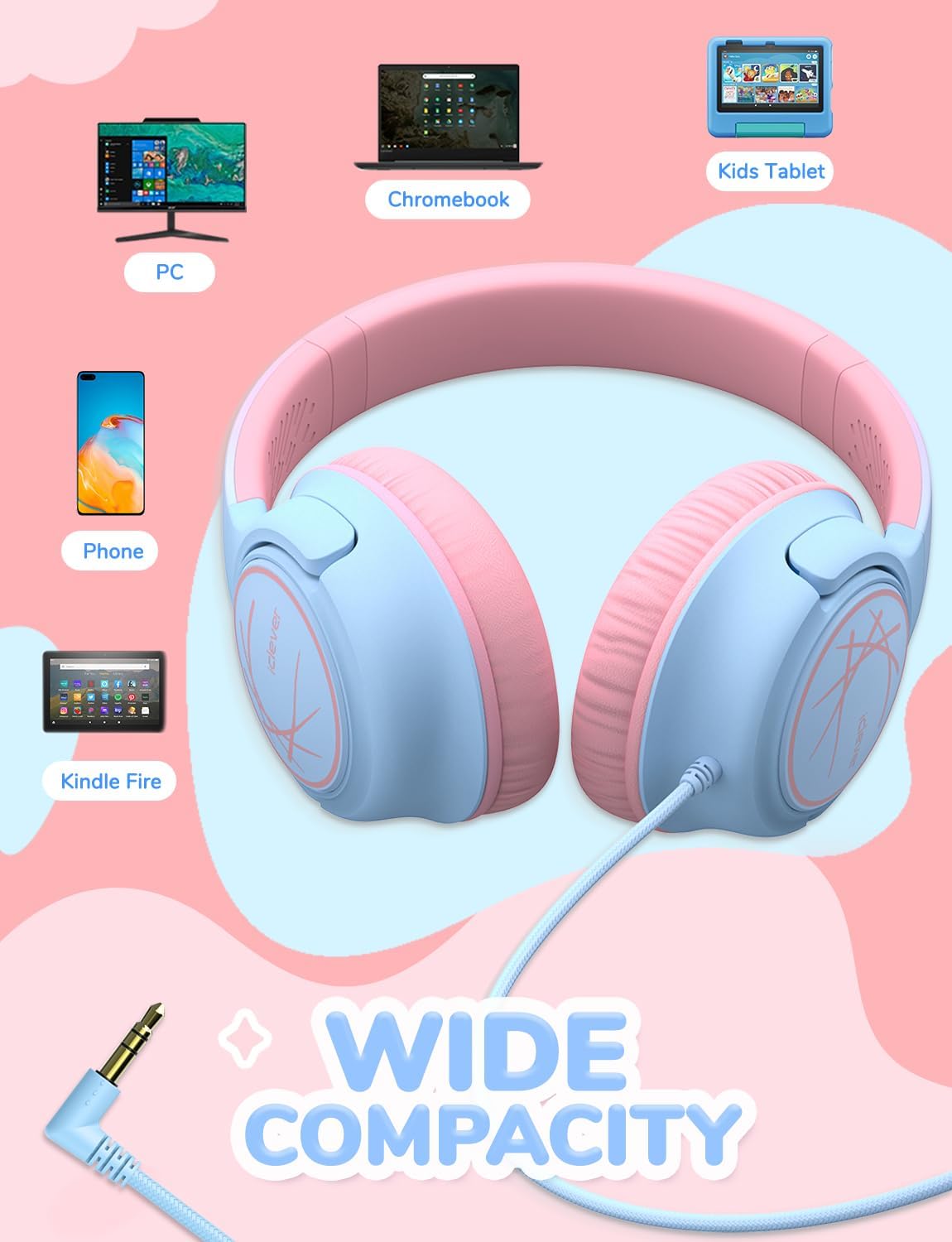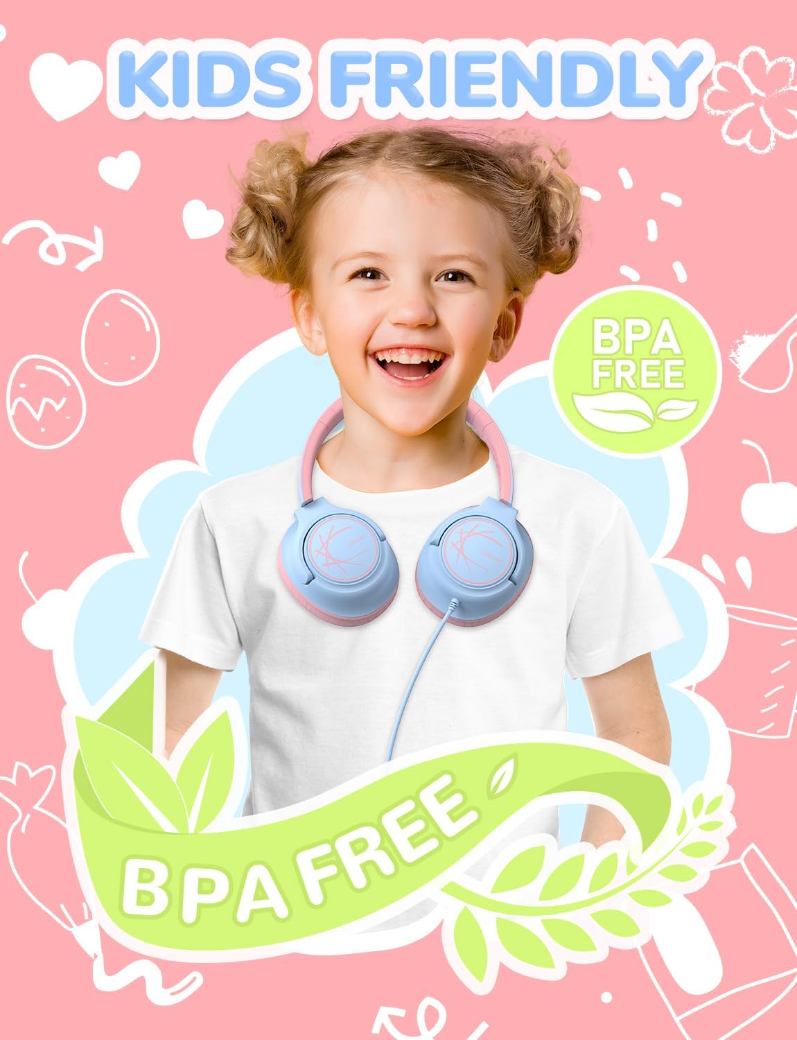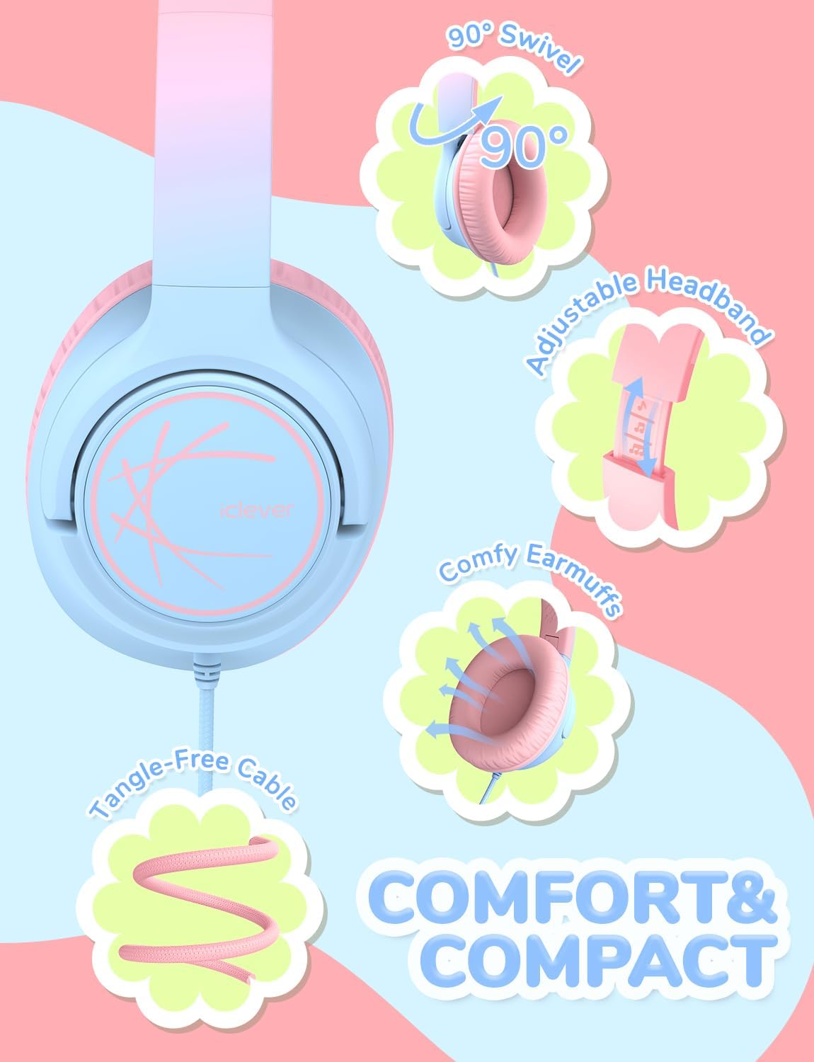 iClever Детски слушалки с кабел, 85 dBA безопасна сила на звука, стерео звук, сгъваеми, върху ушите, 3.5 мм жак, детски слушалки за iPad, таблети, училище, пътуване, синьо-розови