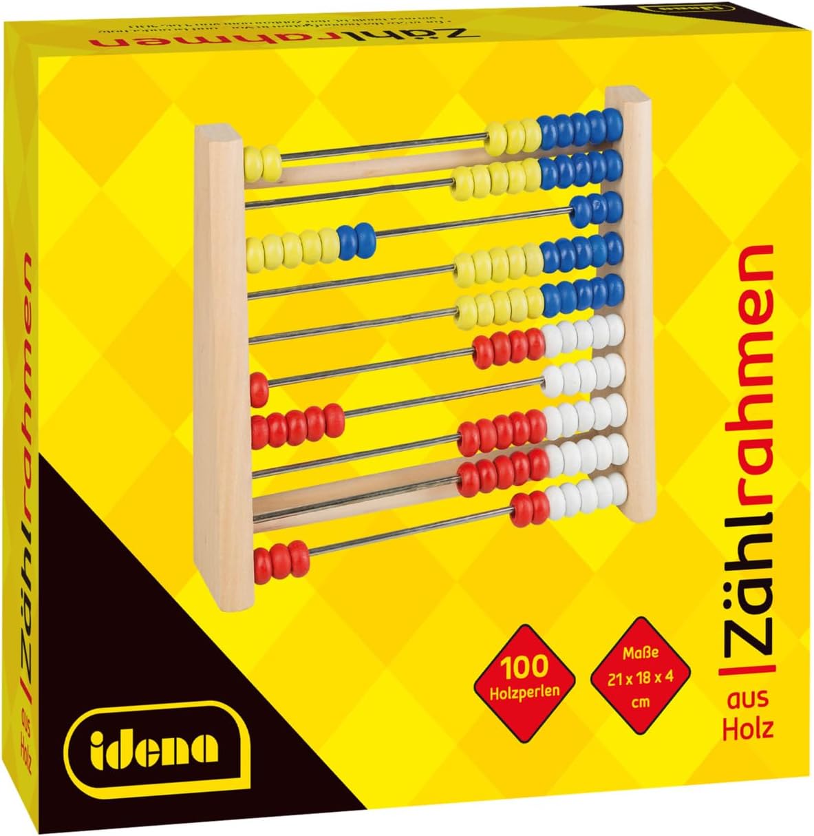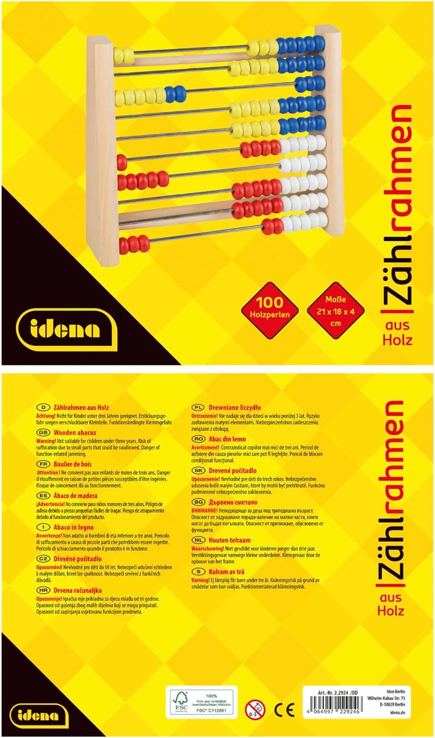 Колко е 3 по 12 плюс 6? Какъв е резултатът от 72, делено на 6, и след това изваждане на 3? Дори сложни математически задачи като тези могат да бъдат решени с лекота с помощта на рамката за броене Idena. Това практично сметало помага на детето ви да научи числата и ясно демонстрира четирите основни аритметични операции. Рамката е с размери приблизително 21 x 18 x 4 см и е изработена от устойчива брезова дървесина, сертифицирана по FSC. Помощното средство за броене има 10 метални пръчки, всяка с 10 ярко боядисани дървени мъниста, които могат да се местят напред-назад по желание. Това прави първите опити за броене и смятане истински лесни.