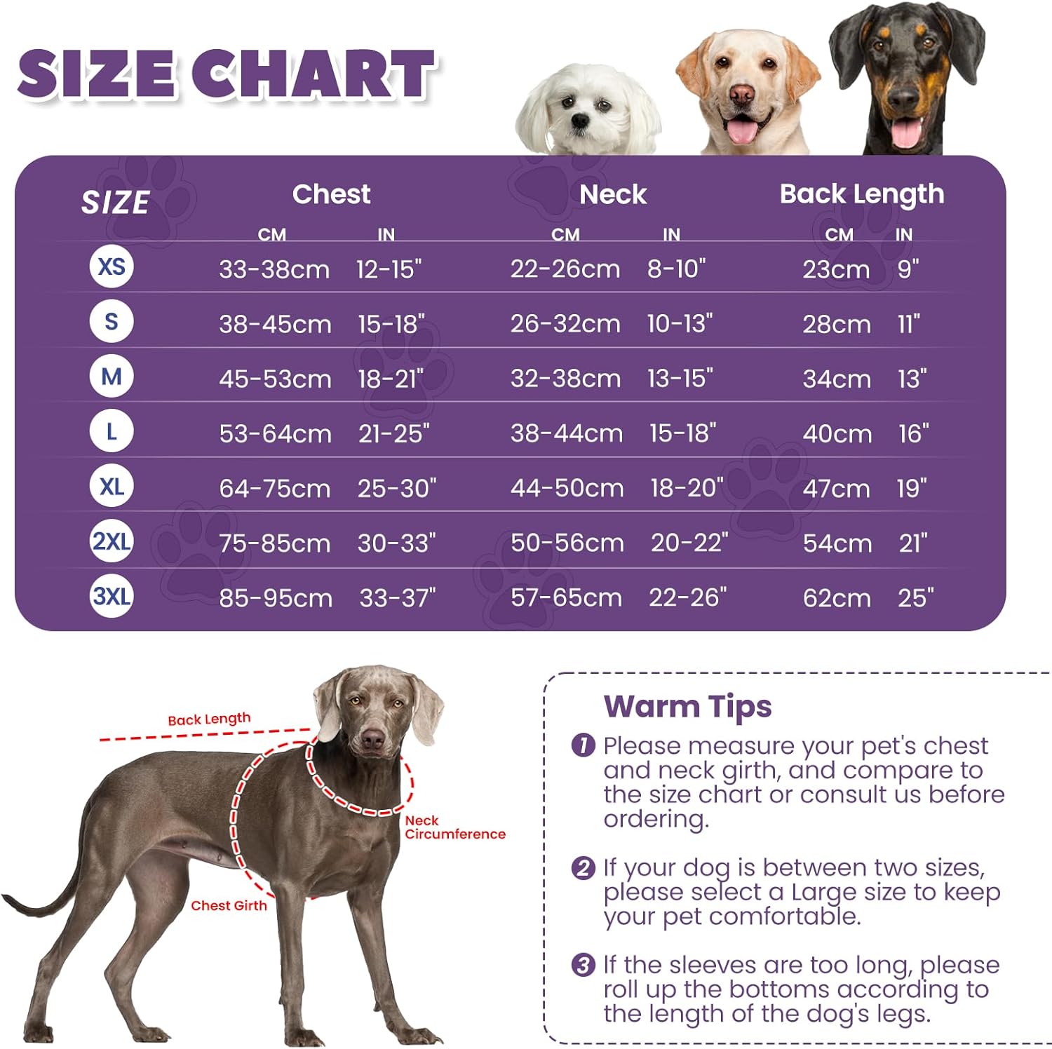 • НАЛИЧНИ РАЗМЕРИ S-3XL: Този следоперативен костюм за кучета е подходящ за повечето малки, средни и големи кучета, като булдози, ротвайлери, пудели, бийгъли, френски булдози, голдън ретривъри, лабрадори и др. Моля, обърнете внимание, че информацията за породата е само за справка. Ако размерът на вашето куче е между два размера, изберете по-големия. Ако възстановителните ръкави са твърде дълги за задните крака, можете просто да ги навиете.