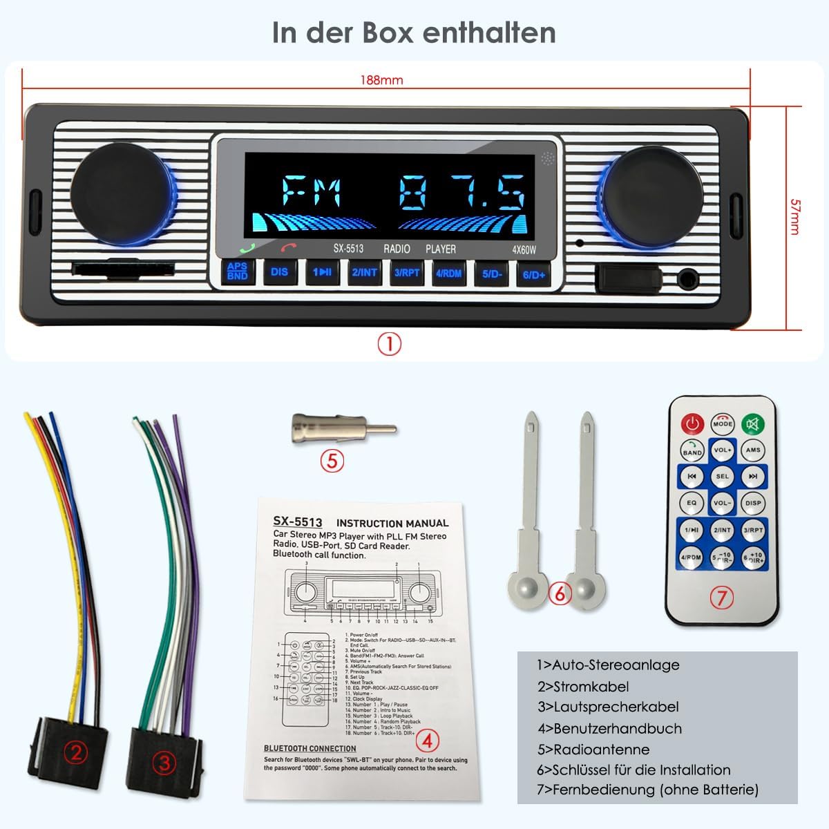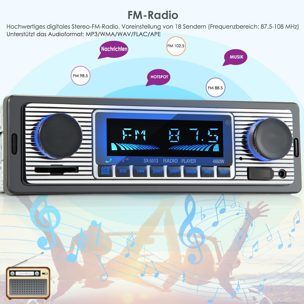 • FM радио и цветна подсветка: Открийте нашето Bluetooth автомобилно радио с кристално чисто FM радио (87.5-108 MHz) и богата мощност 4 x 60 W. Автомобилното радио с Bluetooth осигурява безжична свобода за музика и разговори. 7 цвята регулируема светлина 1 DIN автомобилно радио Bluetooth. Цветът на автомобилното радио може да се регулира с бутона: зелено, синьо, червено, жълто, бяло, тюркоазено зелено и лилаво.