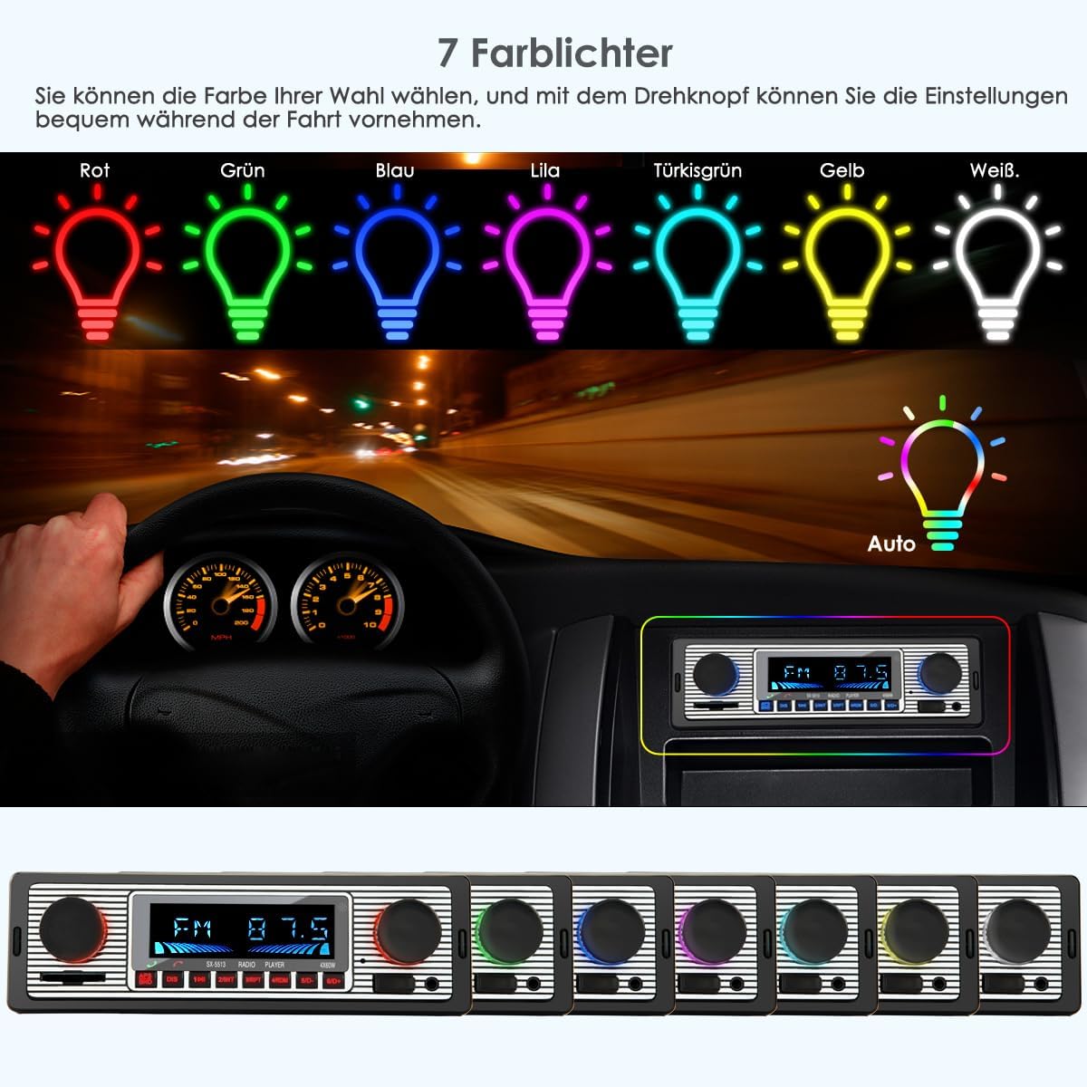 • 7-цветно автомобилно радио: 7-цветно регулируемо автомобилно радио с Bluetooth. Цветът на автомобилното радио може да се регулира с бутона: зелено, синьо, червено, жълто, бяло, тюркоазено зелено и лилаво. Автомобилно радио с Bluetooth устройство за свободни ръце.