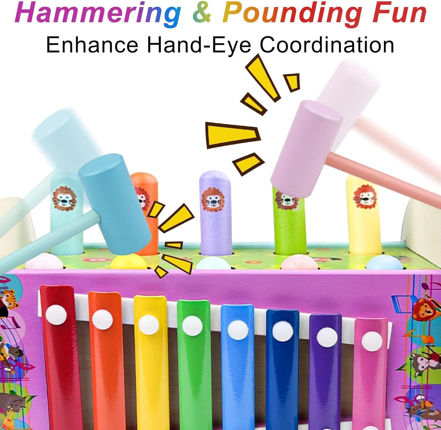 • 【Ранно образование и ползи】 Игра с чук: Внимателно проектираните играчки за ранно образование могат да подобрят концентрацията и времето за реакция на децата по време на игра, да тренират координацията между ръцете и очите, да разпознават основни понятия като цвят и форма и да насърчат фината моторика и логическото мислене.