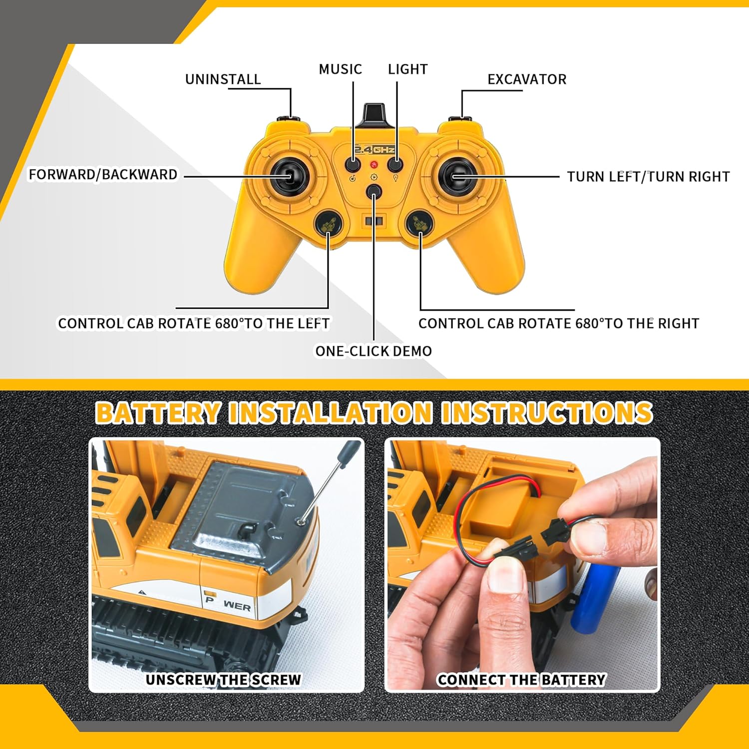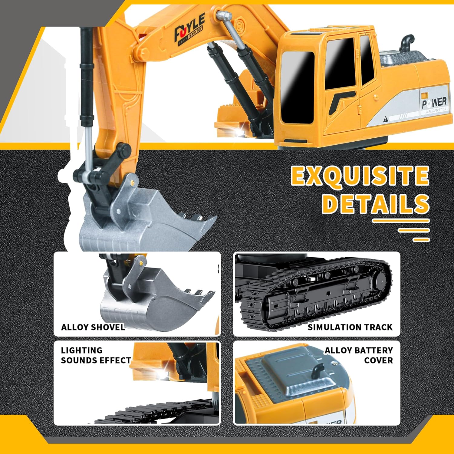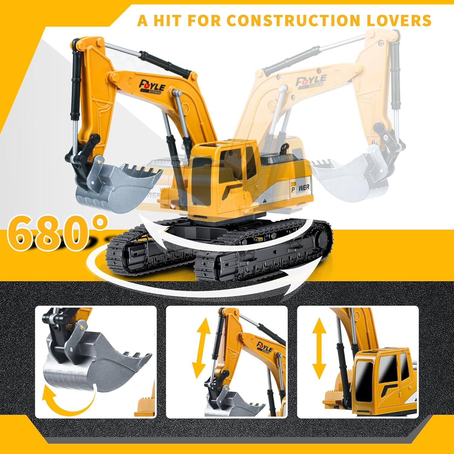 Играчка багер с дистанционно управление, 2.4GHz RC играчка багер за момчета на възраст 3 4 5 6 7 8 години, 1:24 камион багер за момчета с метална лопата, светлини и звук, въртене на 680°