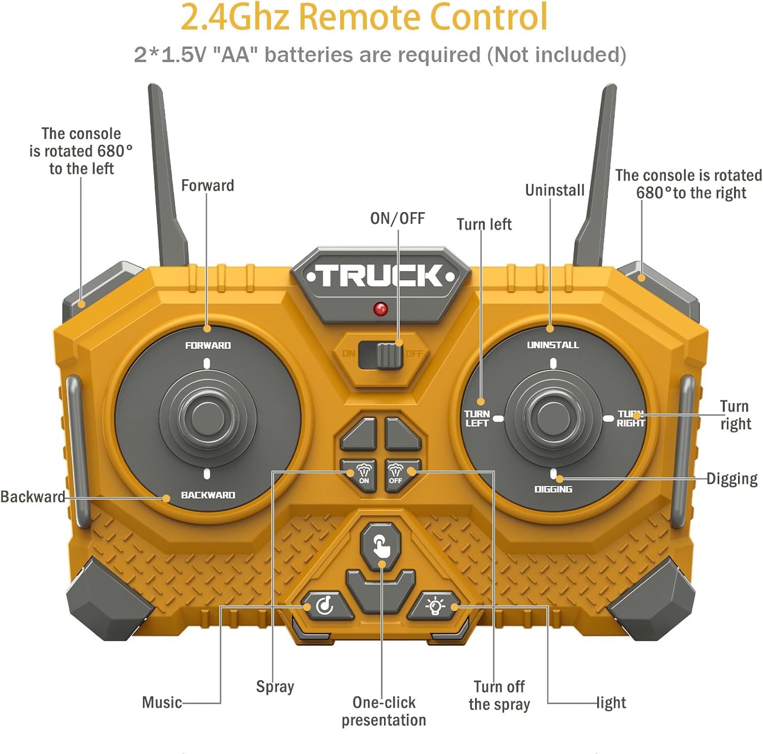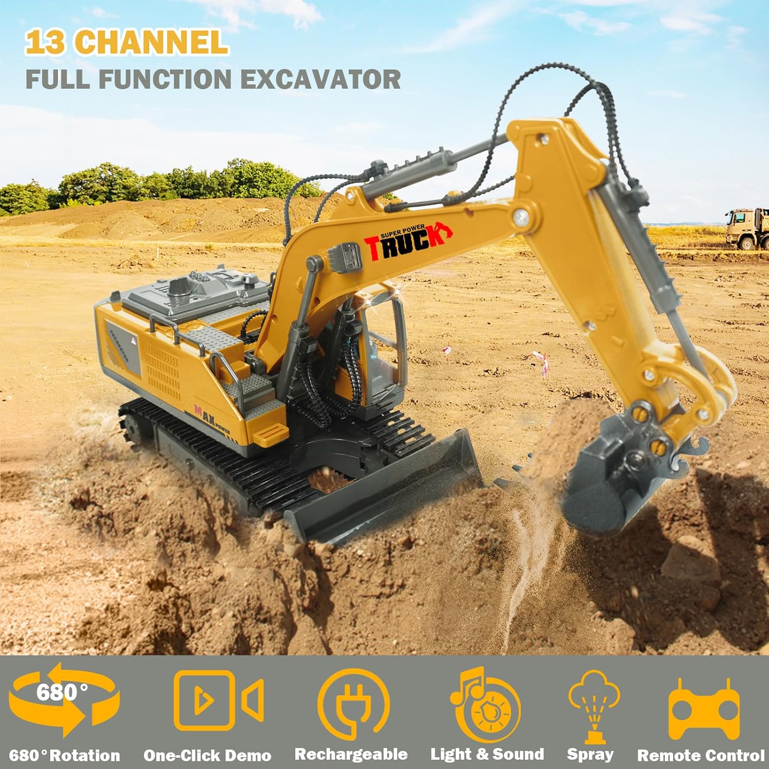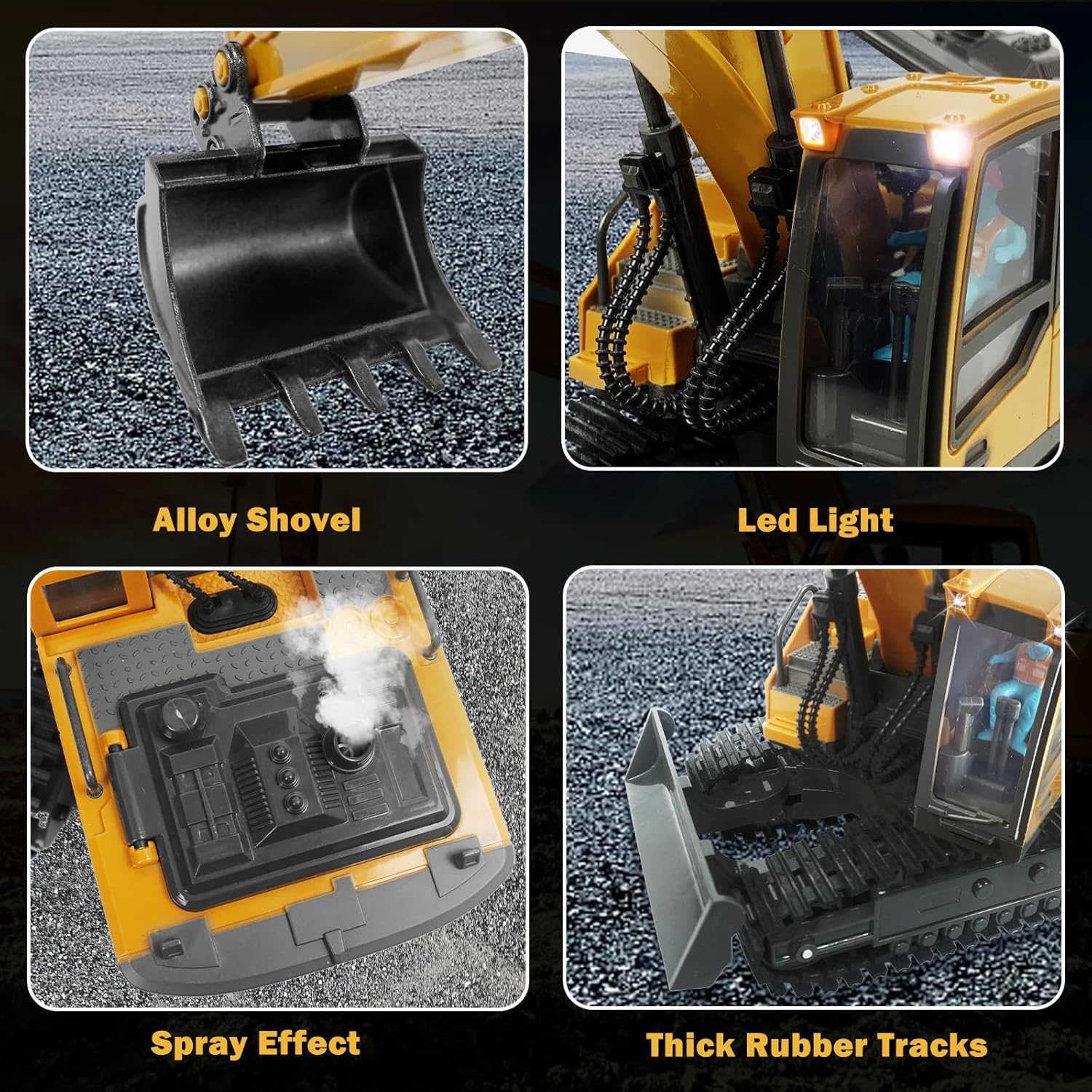 • Пълнофункционален RC багер: тази играчка багер с дистанционно управление от 3 до 8 години има мощен мотор и тежки вериги и може да се движи по пясъчник, плаж или друга земя. Движете горните и долните рамена/напред/назад/наляво/надясно, за копаене и преместване на рохкав пясък, 360° завъртане на място и 680° завъртане на кабината (340° във всяка посока), копаене с един бутон, автоматична демонстрация с един бутон, LED осветление и реалистичен шум от двигателя и др.