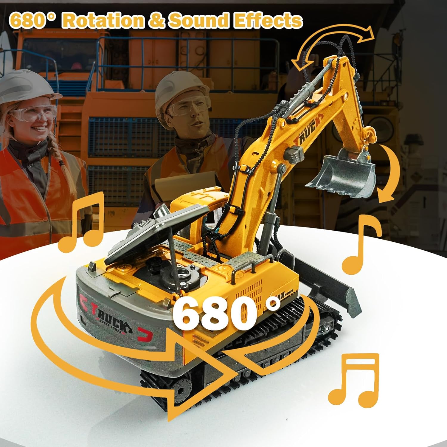 Играчка багер с дистанционно управление RedCrab за деца, 2.4 GHz багер с метална лопата, въртящ се на 680° RC багер със светлина и звук, коледен подарък за рожден ден за момчета от 3, 4, 5, 6, 7, 8 години