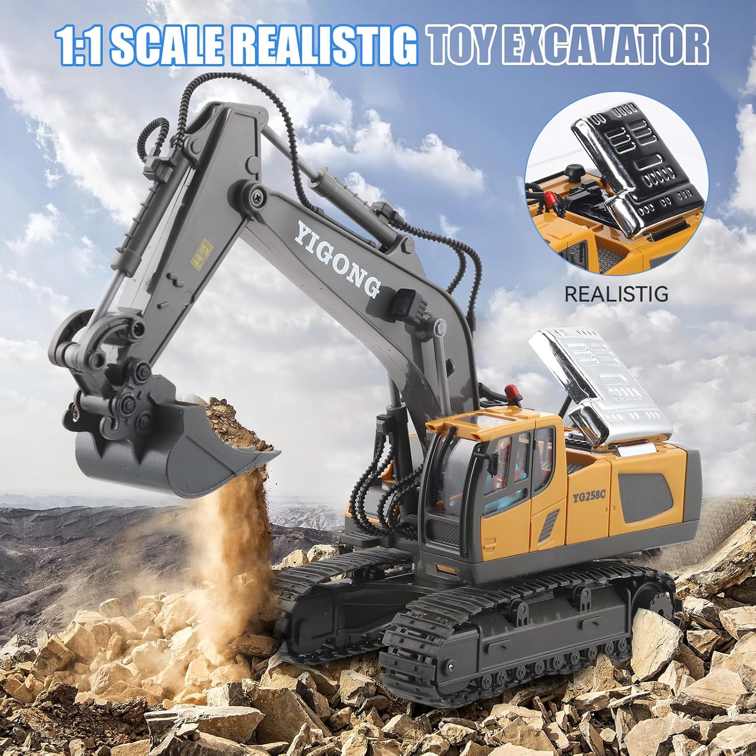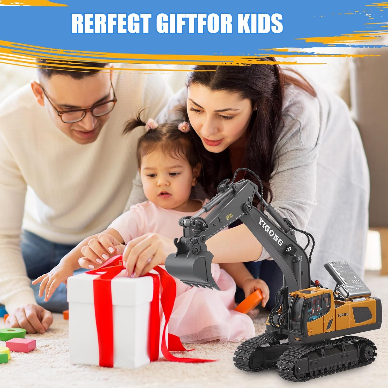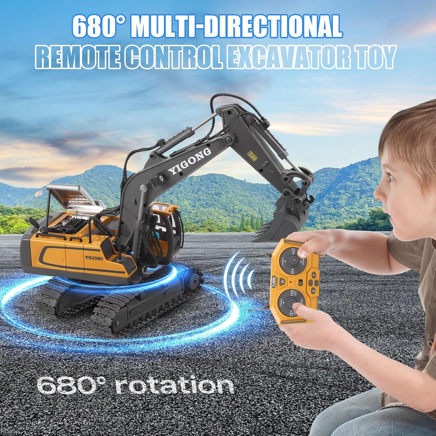 Играчка багер с дистанционно управление със светлина и звук за момчета 3-12 години, 2.4 GHz акумулаторен RC багер с алуминиева лопата и въртене на 680°, детски подарък за момчета за рожден ден и Коледа
