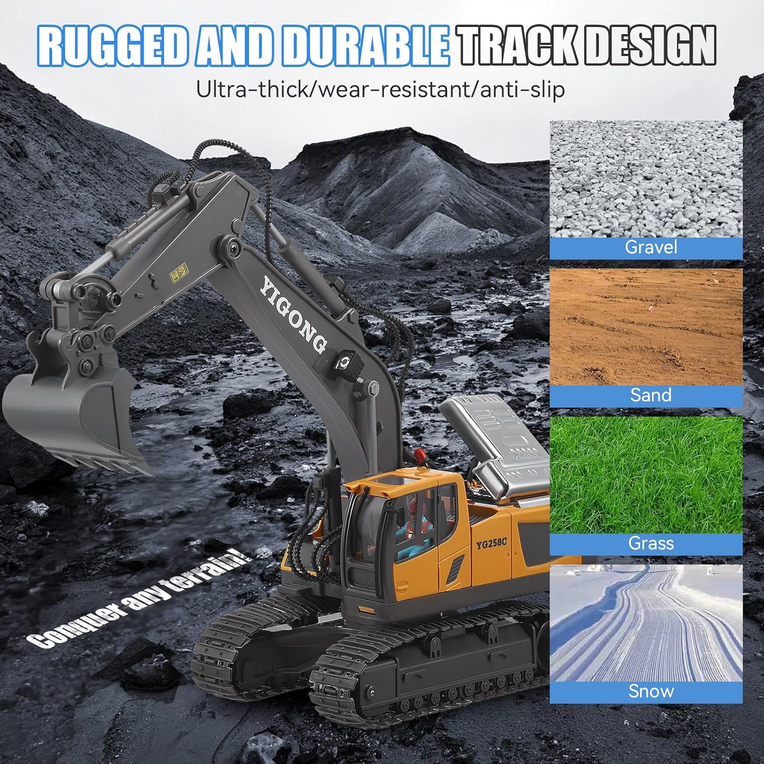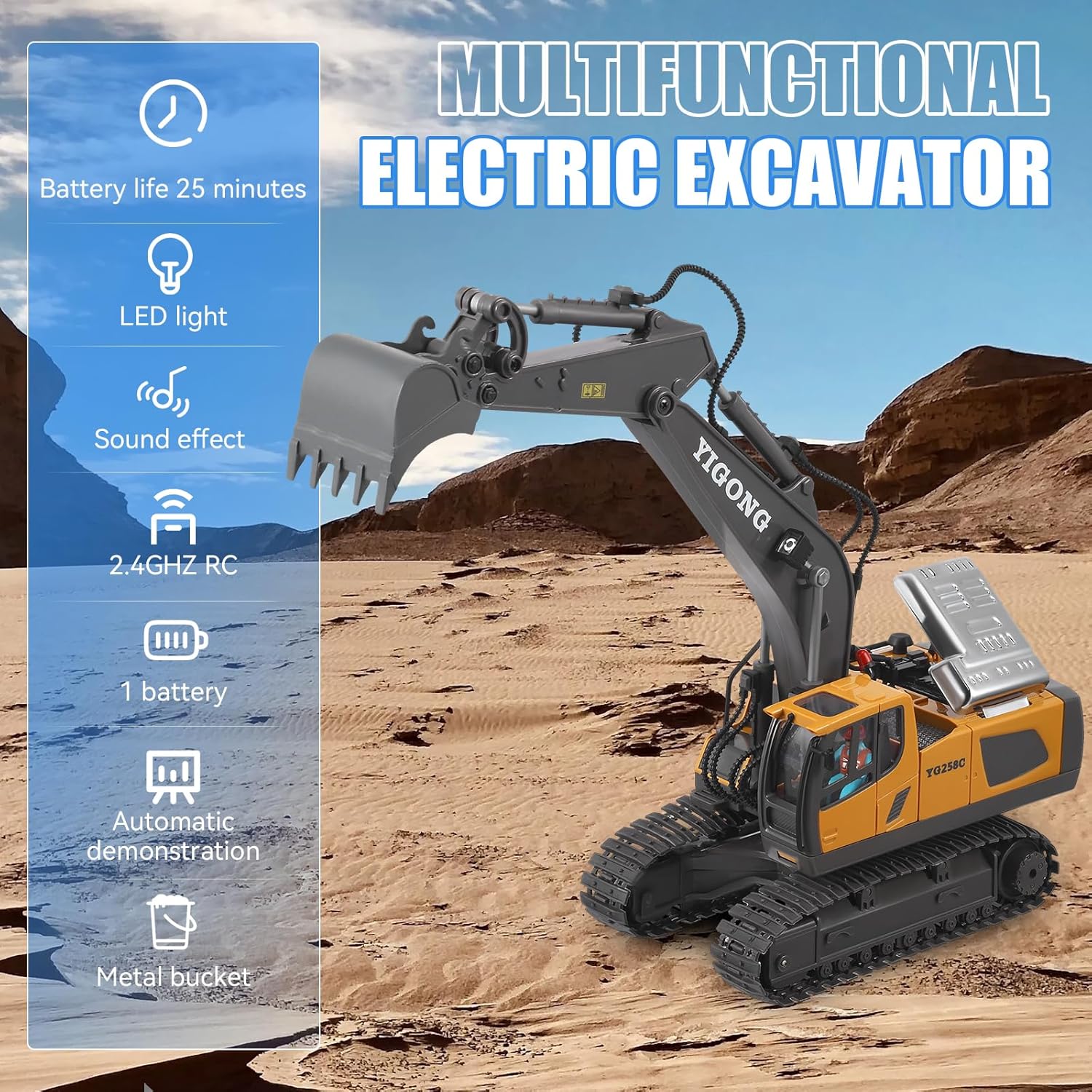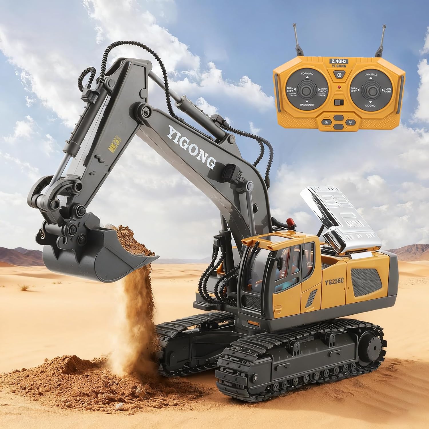 Играчка багер с дистанционно управление със светлина и звук за момчета 3-12 години, 2.4 GHz акумулаторен RC багер с алуминиева лопата и въртене на 680°, детски подарък за момчета за рожден ден и Коледа