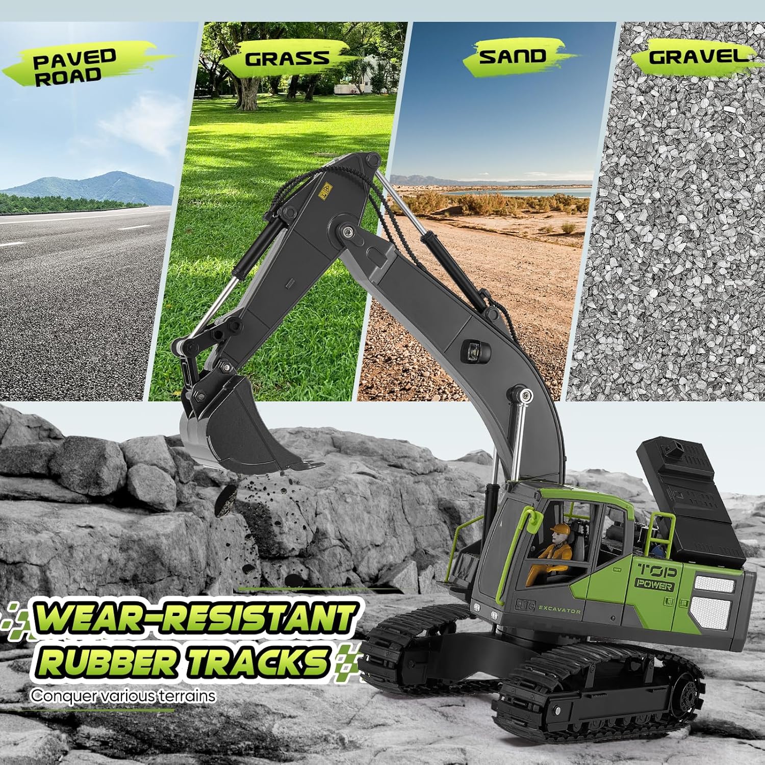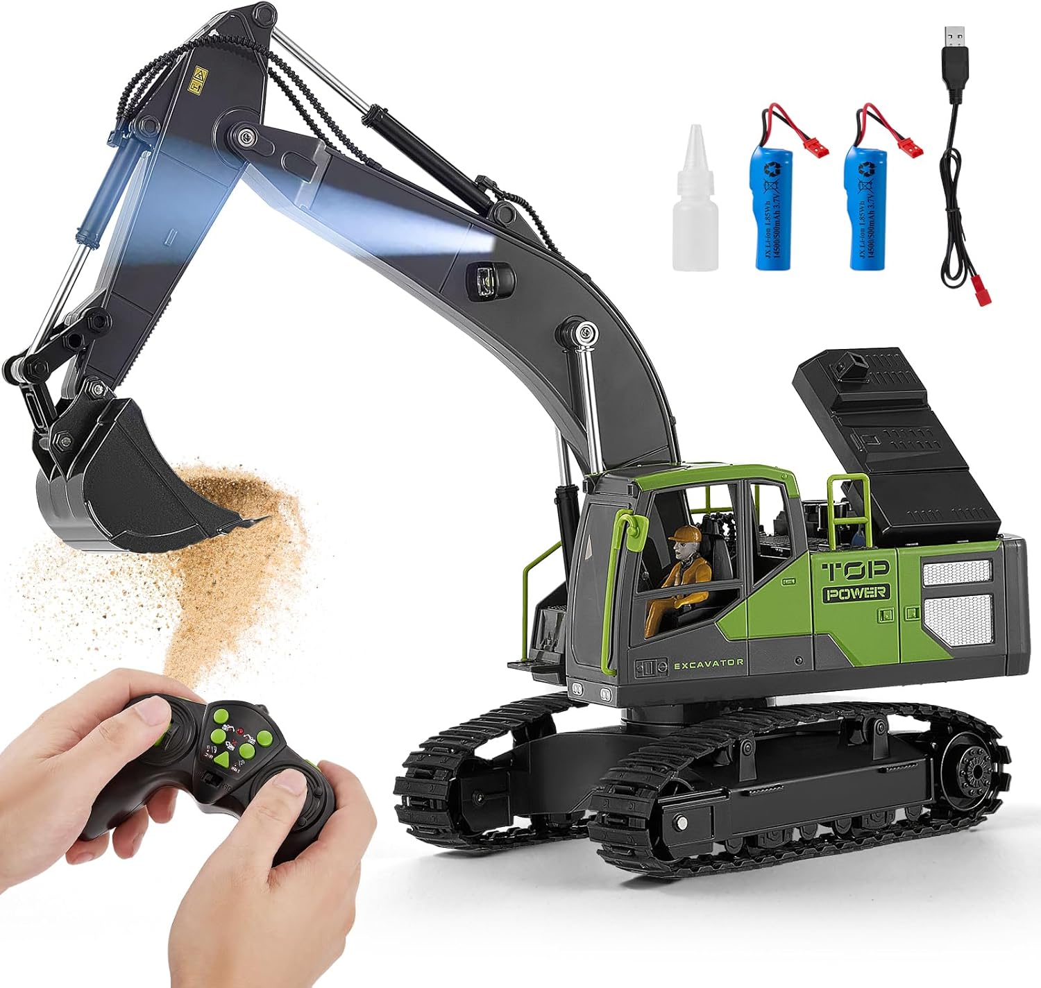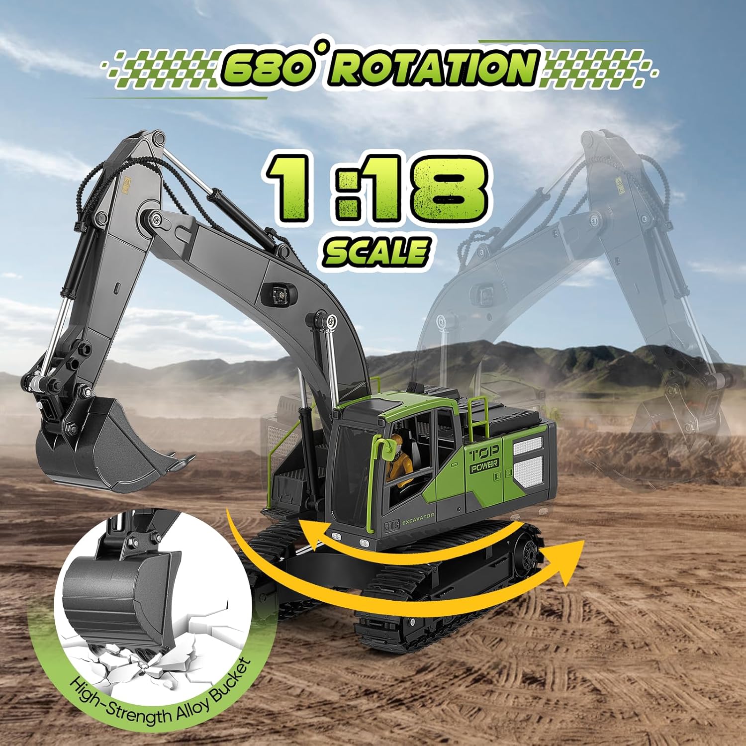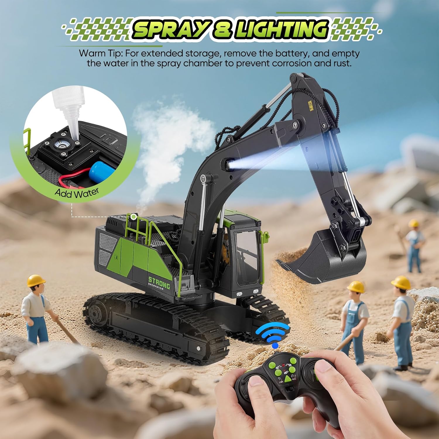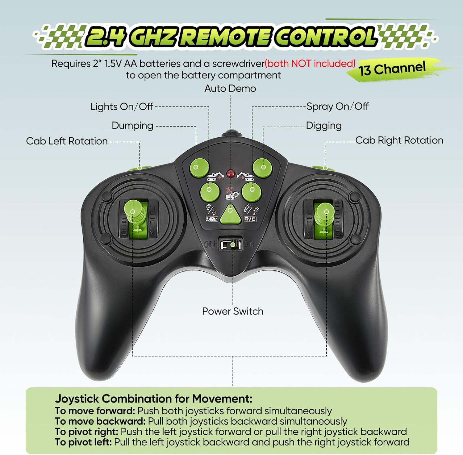 • 【13-канален багер играчка】Този модел поддържа следните функции: копаене/накланяне, напред/назад, въртене надясно/наляво, въртене на кабината (680°), включване/изключване на осветлението, функция за пръскане и демо режим. Автоматичната функция улеснява използването от по-малките деца и повишава интереса към конструирането на играчки.