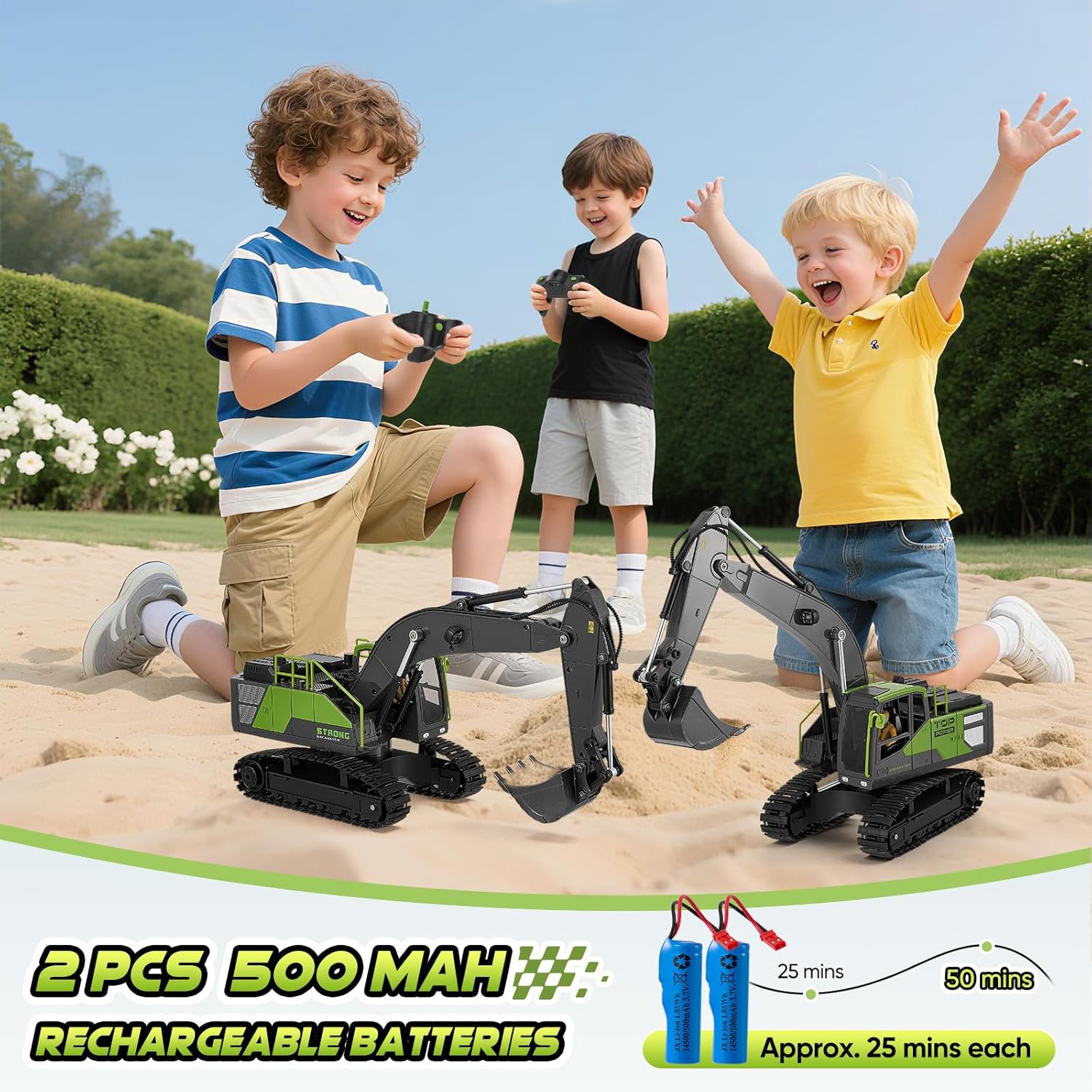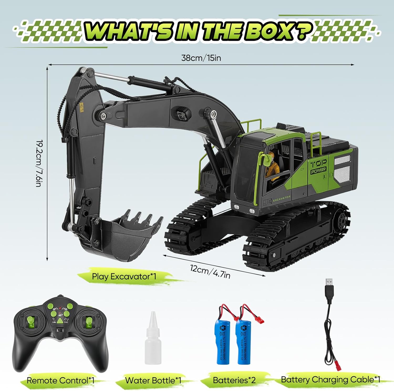 • Дистанционно управление 2.4 GHz и 2 батерии: дистанционното управление 2.4 GHz позволява прецизна и безпроблемна игра с обхват от приблизително 25 м. Екскаваторът включва две презареждащи се батерии от 500 mAh за до 50 минути непрекъснато забавление на открито. Включен е кабел за зареждане.