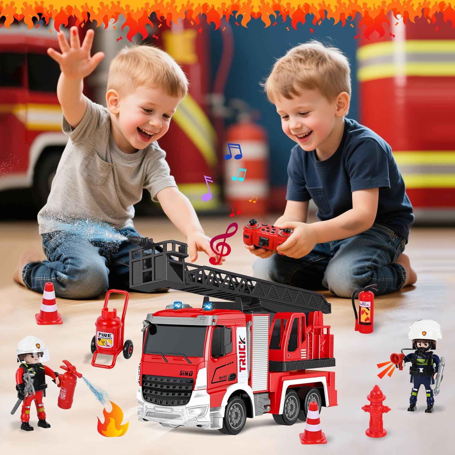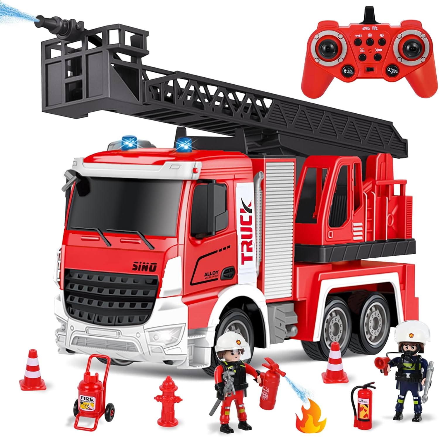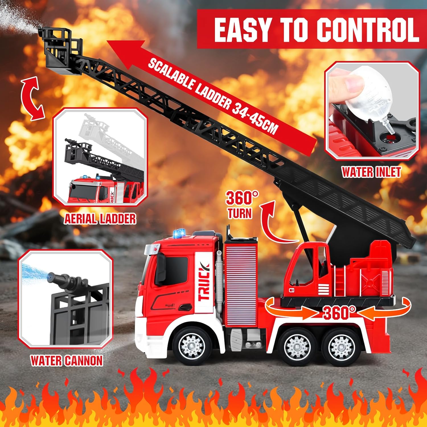 Играчка кола за пожарна, въртяща се стълба 2.4G, играчка пожарникар с стълба 83 см, функция за пръскане, LED сигнални светлини, аксесоари за кукли, подаръци за момчета и момичета от 3 години