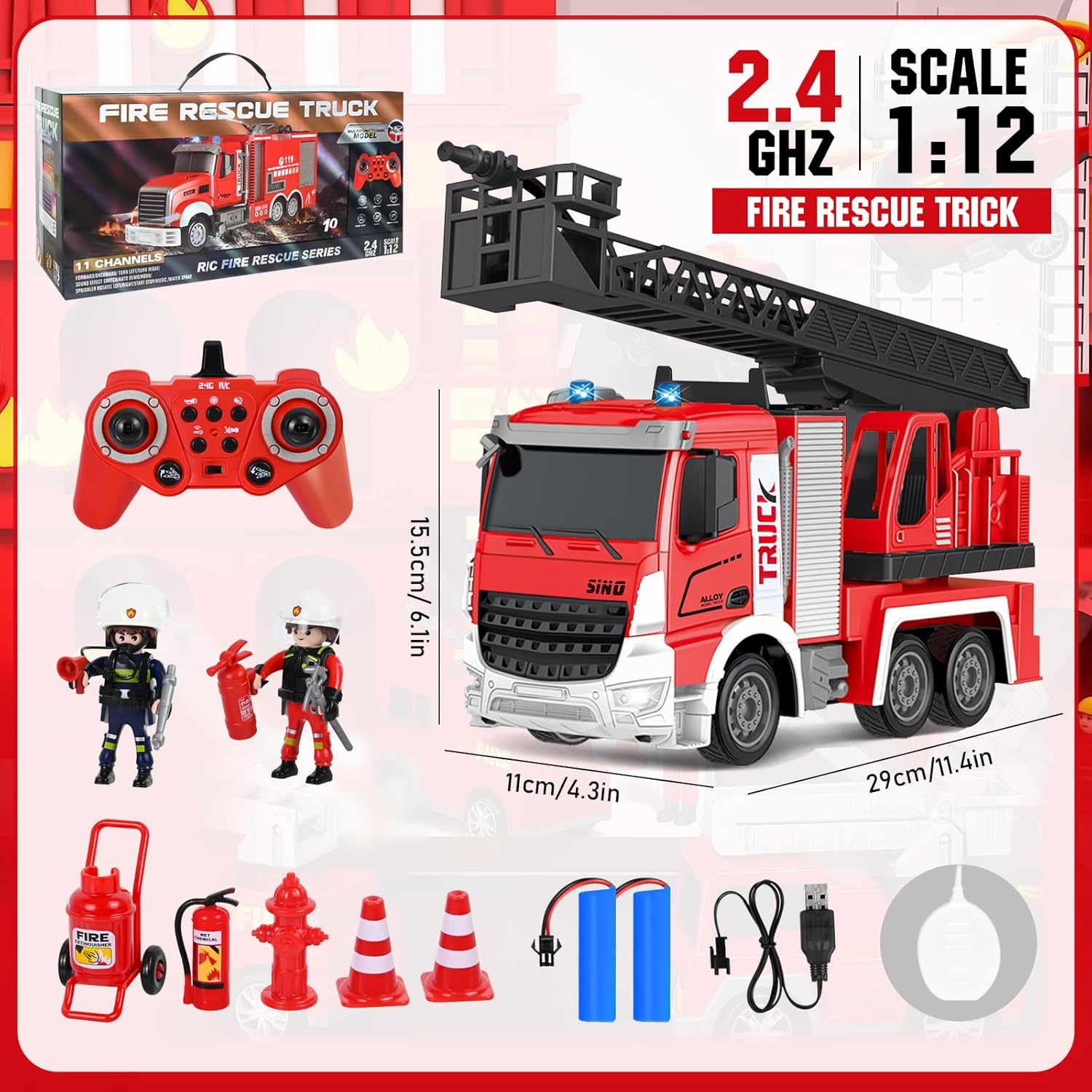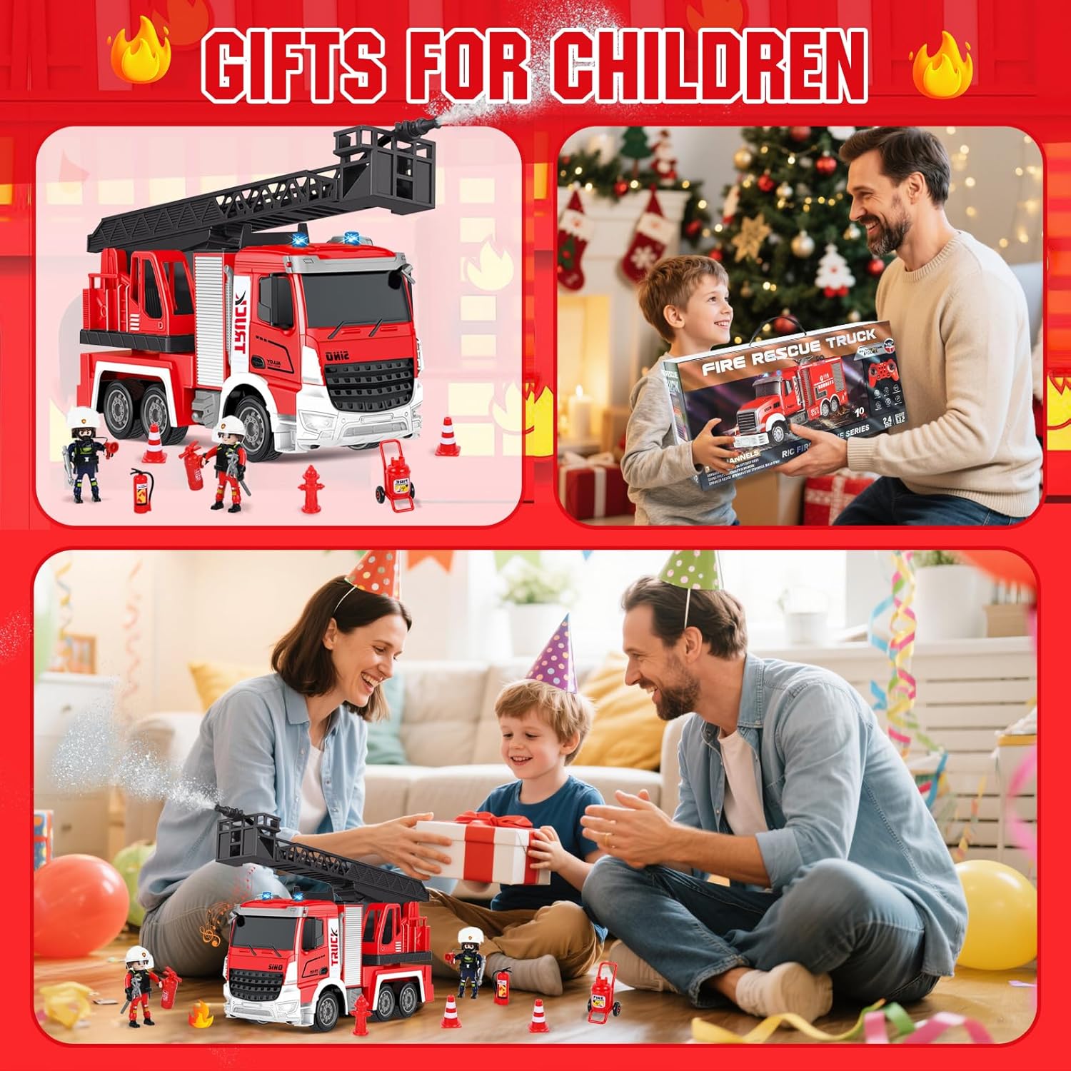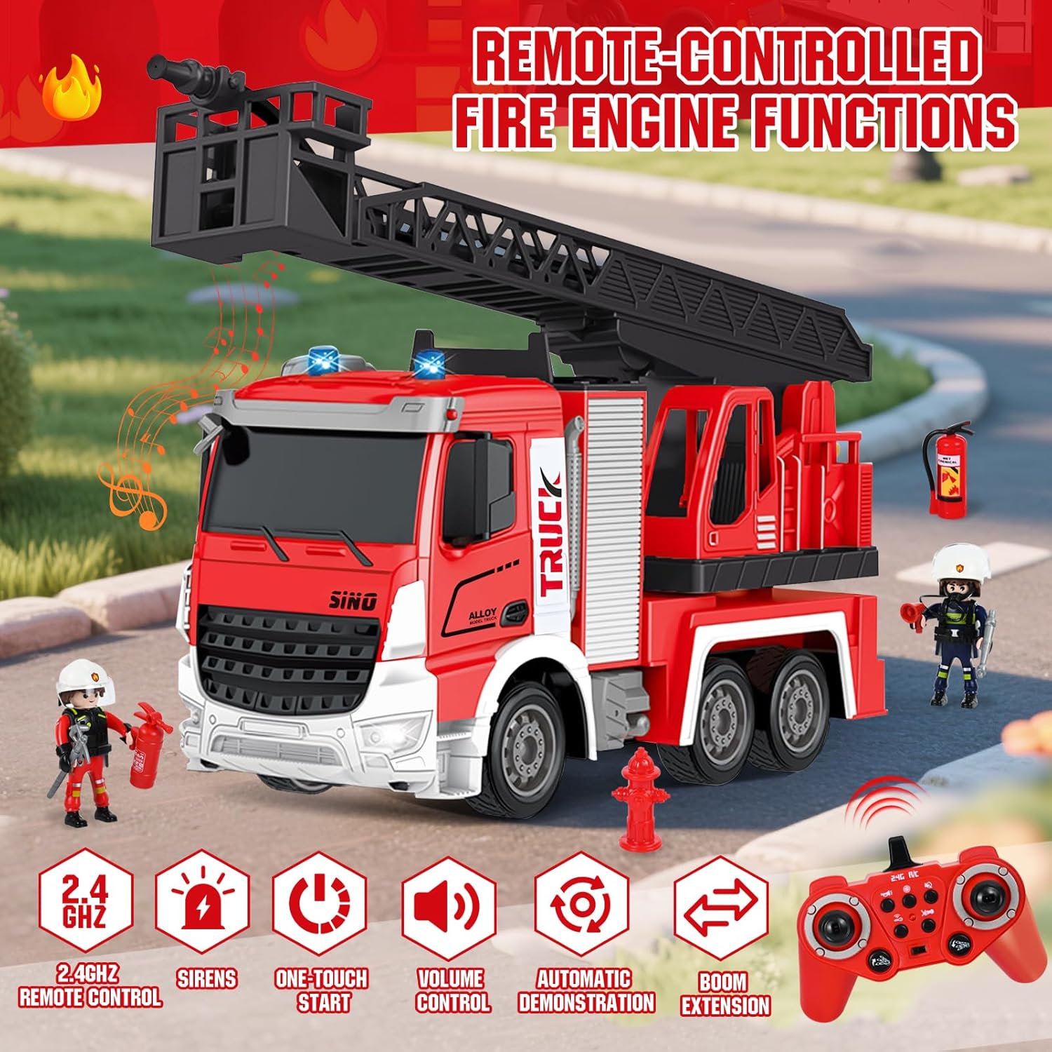 Играчка кола за пожарна, въртяща се стълба 2.4G, играчка пожарникар с стълба 83 см, функция за пръскане, LED сигнални светлини, аксесоари за кукли, подаръци за момчета и момичета от 3 години