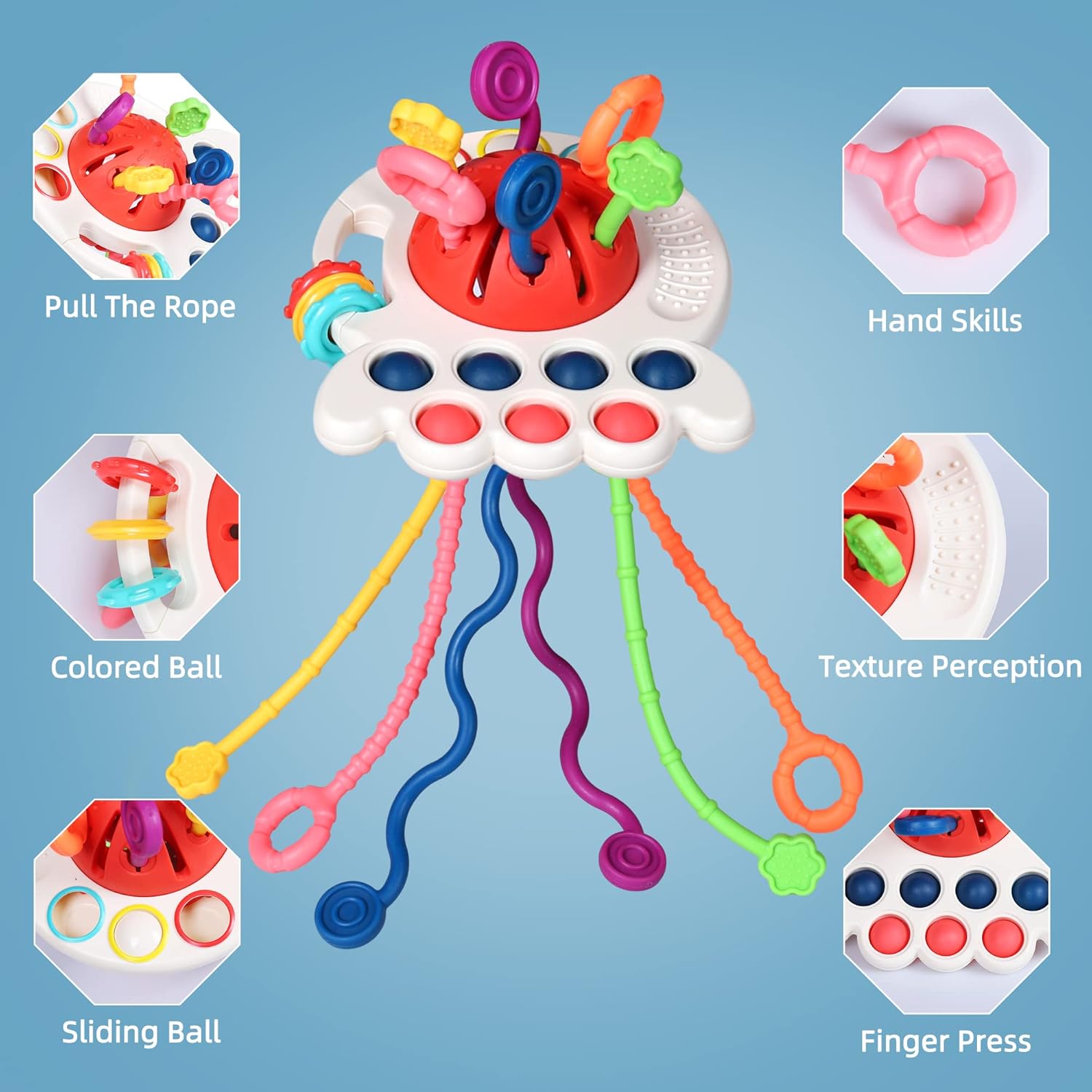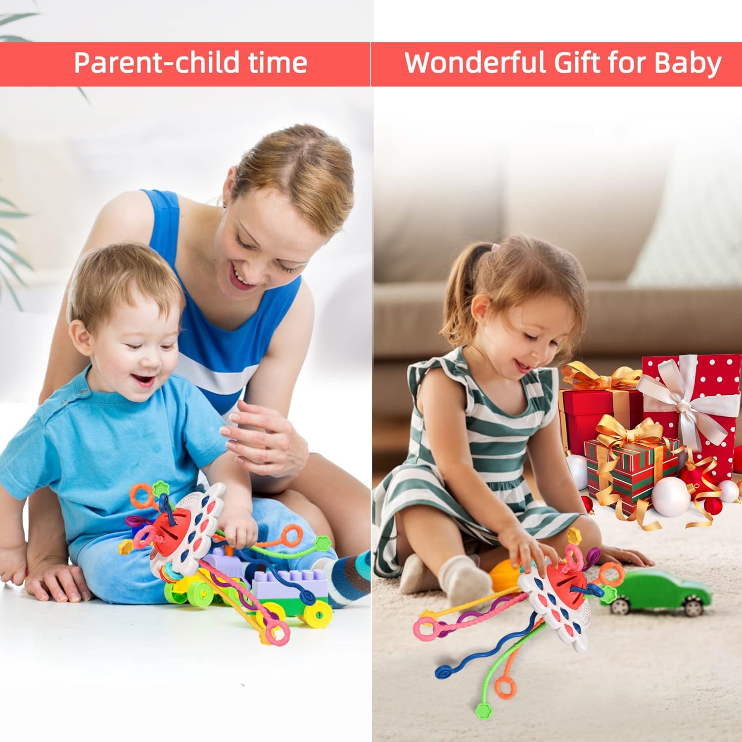 Има много начини за игра. Някои са лесни за хващане и дърпане, други са по-предизвикателни. Можете да разтегнете меките, цветни въжета, за да усетите различното напрежение. Можете също да натиснете меките силиконови копчета и да плъзнете пластмасовите копчета, за да стимулирате слуха и чувството за допир на бебето си, като по този начин подобрите различните му сензорни умения.