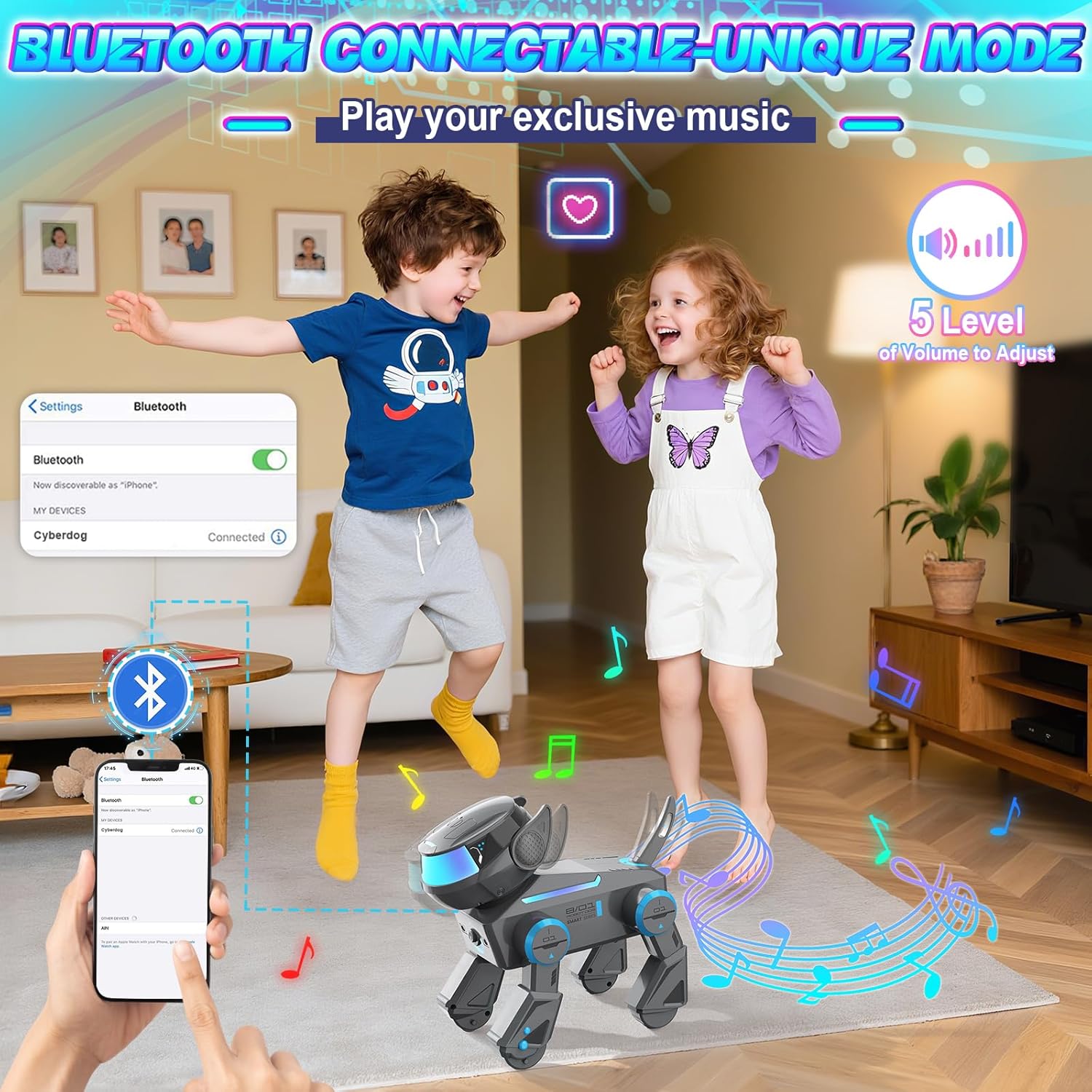 • Игриви звуци чрез Bluetooth: Кучето робот с дистанционно управление е не само другар за игра за деца на възраст 3, 4, 5, 6, 7 и 8 години, но и Bluetooth високоговорител, който лесно може да отговори на различни акустични нужди. Независимо дали става въпрос за детски песнички, приказки, английски за слушане или поп музика, можете да пускате всичко за вашето интелигентно куче робот и да създавате интересен звуков свят за вашите деца, така че всяка игра да е съпроводена от разнообразно звуково изживяване. С 5 избираеми нива на силата на звука можете гъвкаво да превключвате между настройките, за да създадете комфортно пространство за слушане за вашето дете.