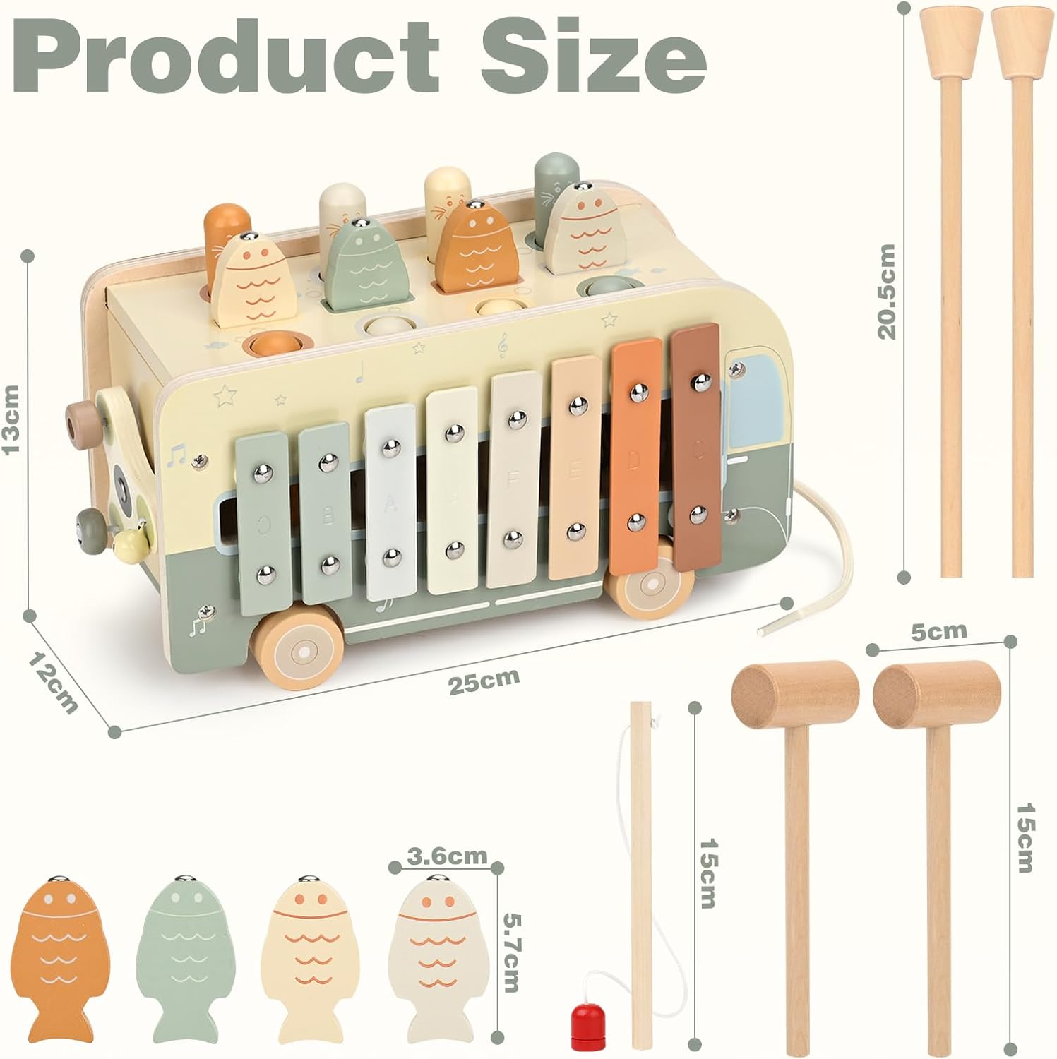 • 7-в-1 играчка Монтесори: Тази бебешка играчка от 1 година съчетава магнитна игра за риболов, интерактивна игра с къртици, ксилофон, въртящи се зъбни колела, лабиринтни предизвикателства, камбанки и плъзгащ се автобус. Тя отговаря на нуждите на децата в областта на сензорните умения, фината моторика и когнитивното развитие и осигурява още повече забавление.