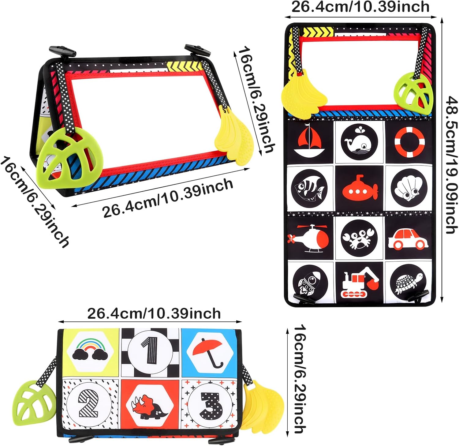 • [Събудете любопитството на вашето бебе] Богатите цветове на меката книжка за бебета привличат вниманието му. Игривият елемент насърчава бебето да открие себе си, като се погледне в огледалото, а черно-белите шарки с висок контраст насърчават развитието на мускулите на главата, врата, гърба и крайниците на вашето бебе.