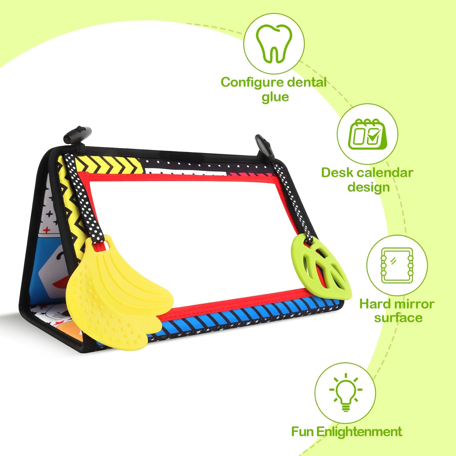 • [Висококачествен материал] Тази висококачествена играчка за бебешки календар с огледало е изработена от нежни към кожата материи и първокласен памук, което я прави безопасна и безвредна и не представлява риск за здравето на вашето бебе. Плоският дизайн на гризалките може ефективно да облекчи дискомфорта при никнене на зъби на вашето бебе.