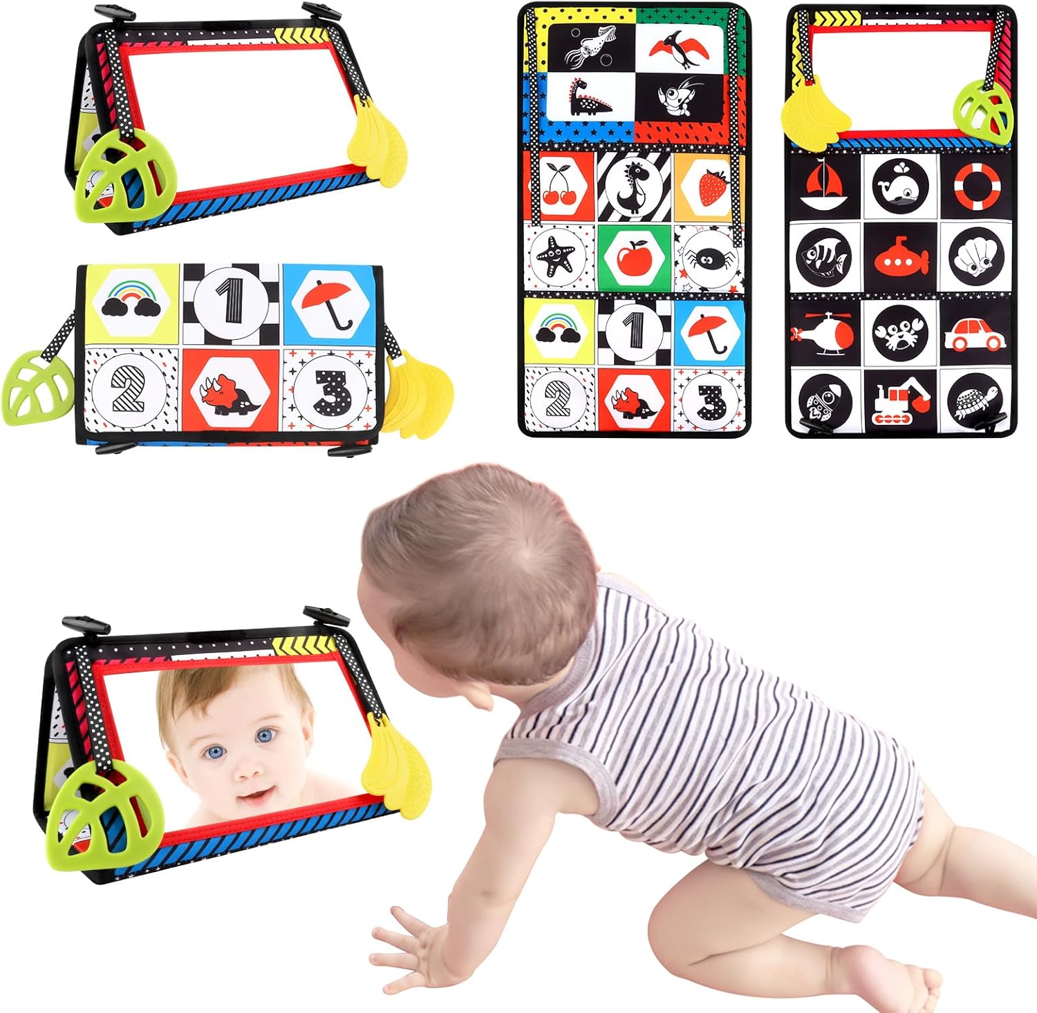 • [Сензорна играчка Монтесори] Бебешката играчка-огледало е с прости шарки с числа, животни, превозни средства и др., за да активира когнитивния режим на бебето за ранно учене. Тя е проектирана според физиологичния процес на развитие на бебето и може да стимулира развитието на зрението и докосването.