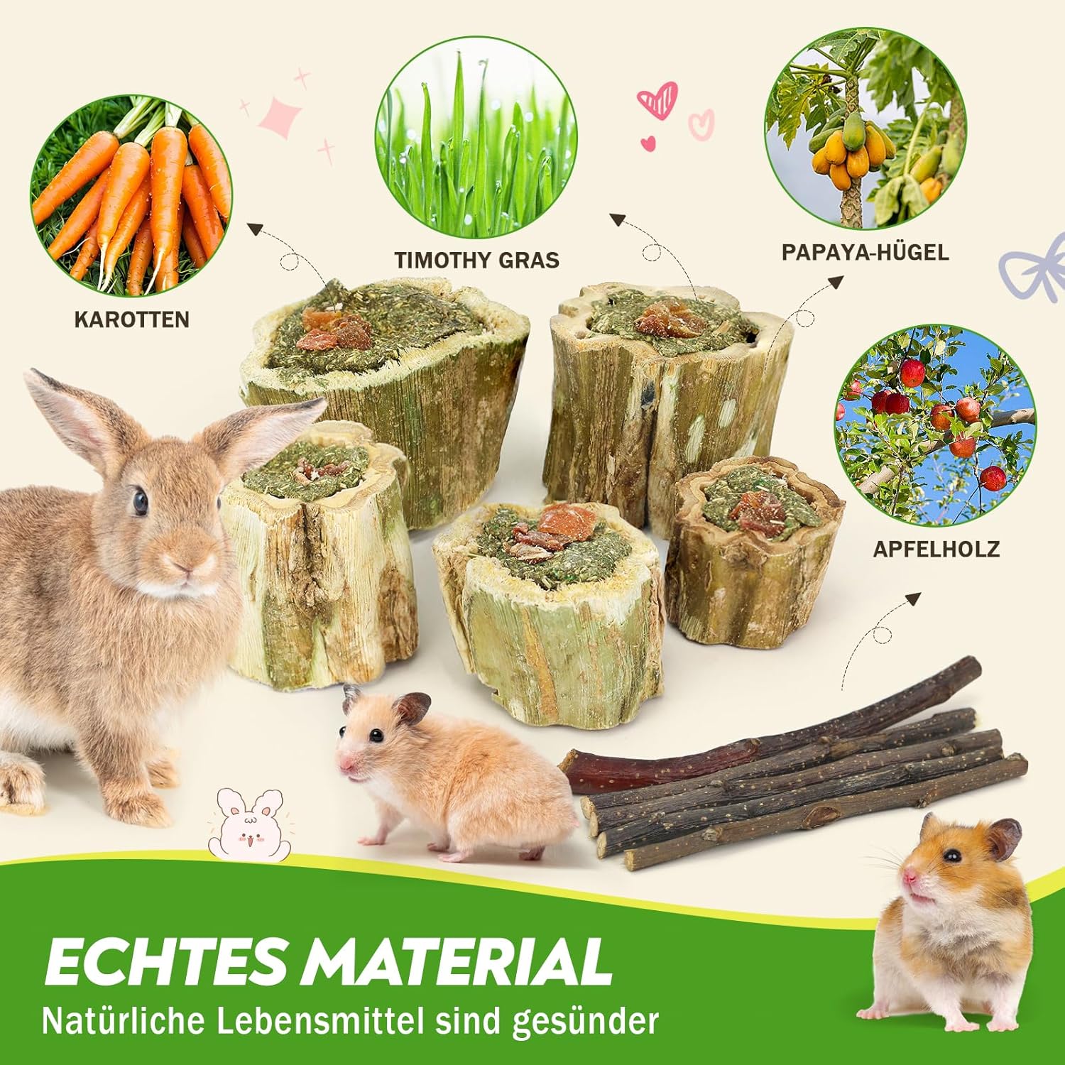 SUITABLE FOR A VARIETY OF SMALL ANIMALS - A bag of 100g papaya chew toys and 5 pieces apple branches, with a variety of natural flavors and flavors to change, which easily arouse small pets' interest in playing. Suitable for various small animals such as rabbits, guinea pigs, chinchillas, hamsters, sand rats, mice, etc., without having to buy separate products for different pets, meeting the diverse needs of families with multiple pets.
