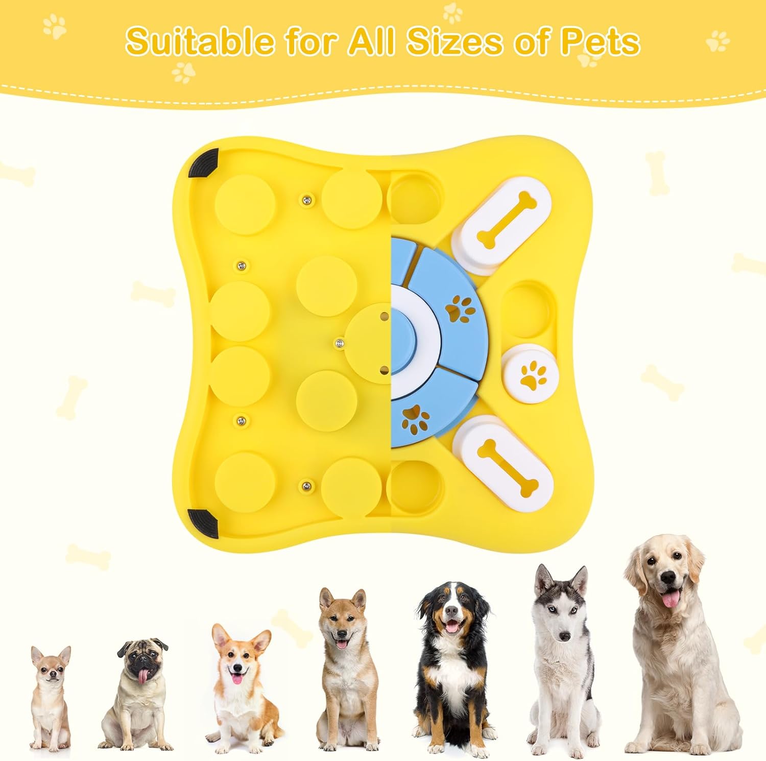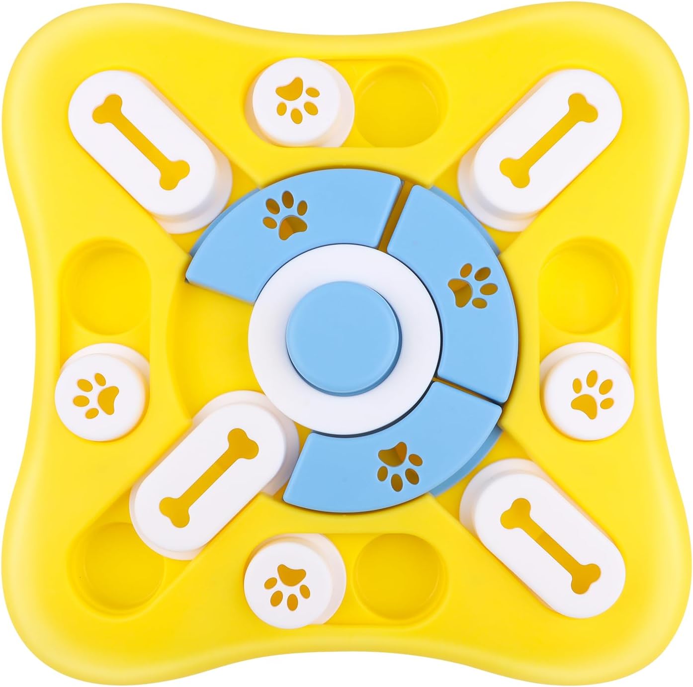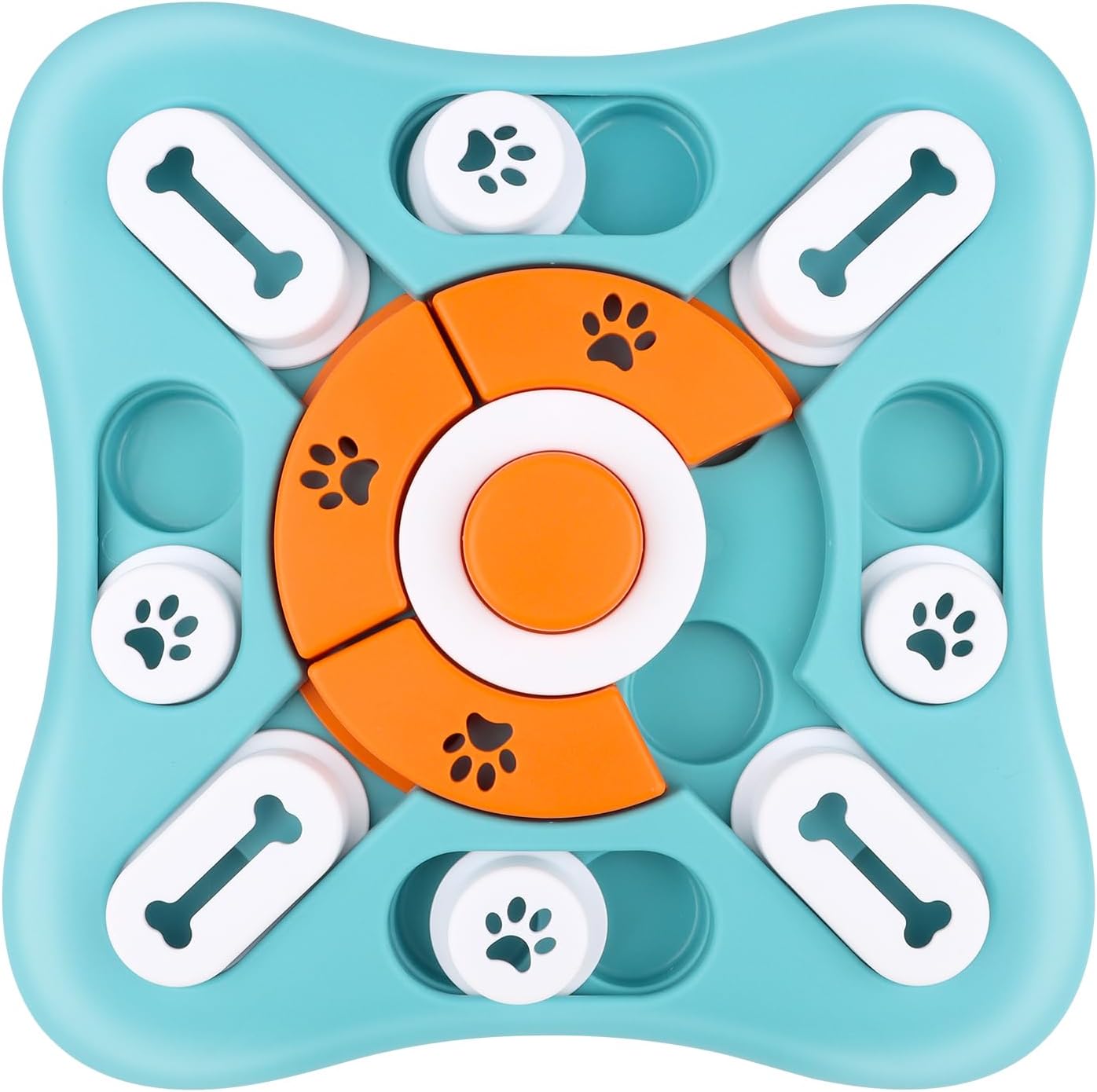 • Подходящо за всички кучета и котки: Чрез поставяне на храна или лакомства под плъзгача, кучетата или котките могат да си заслужат лакомствата с известно умение и търпение. Тази играчка за кучета няма подвижни части, тъй като е оборудвана с вградени фигурки, които не са лесни за премахване. Интелигентната играчка за кучета (25,4 x 25,4 x 3 см) е подходяща за големи, средни и малки кучета.
