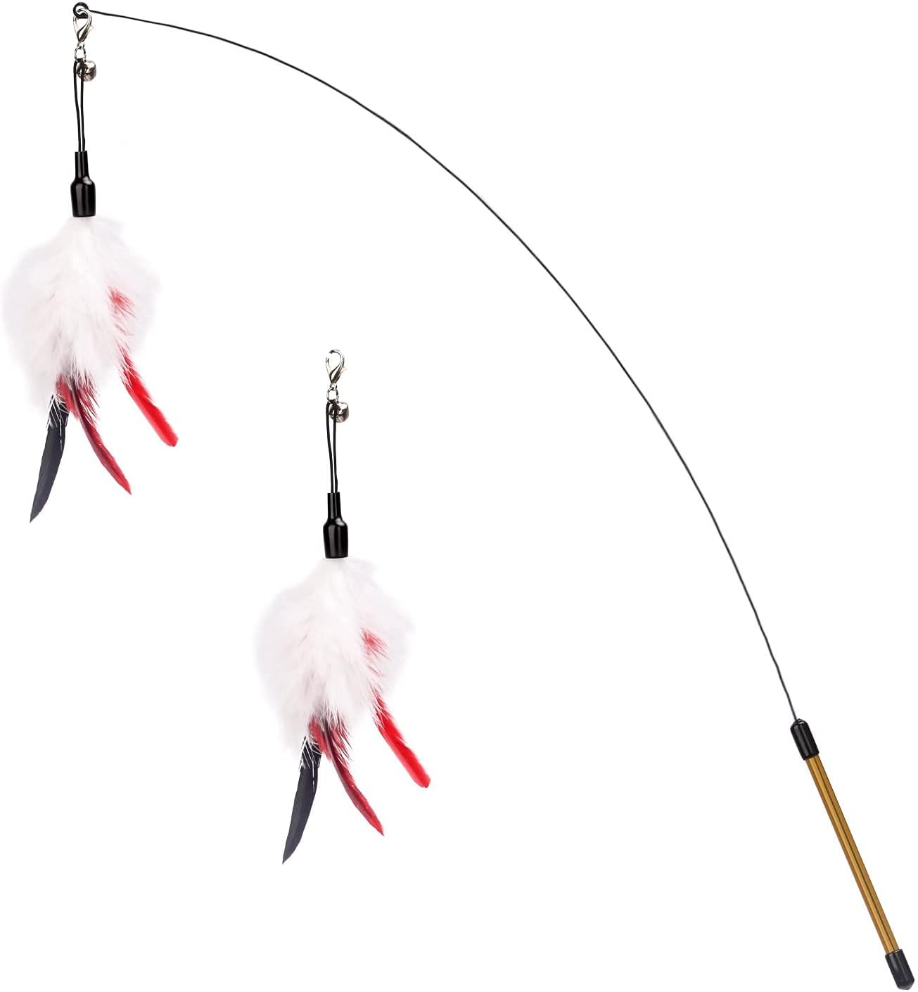 Играчка за котки Pawaboo Feather Teaser, интерактивна играчка за котки от пера, ловец на летящи пера с екстра дълга пръчка 31,5" и малък звънец, играчка за игра с котенце или котка, бордо червено и бяло перо