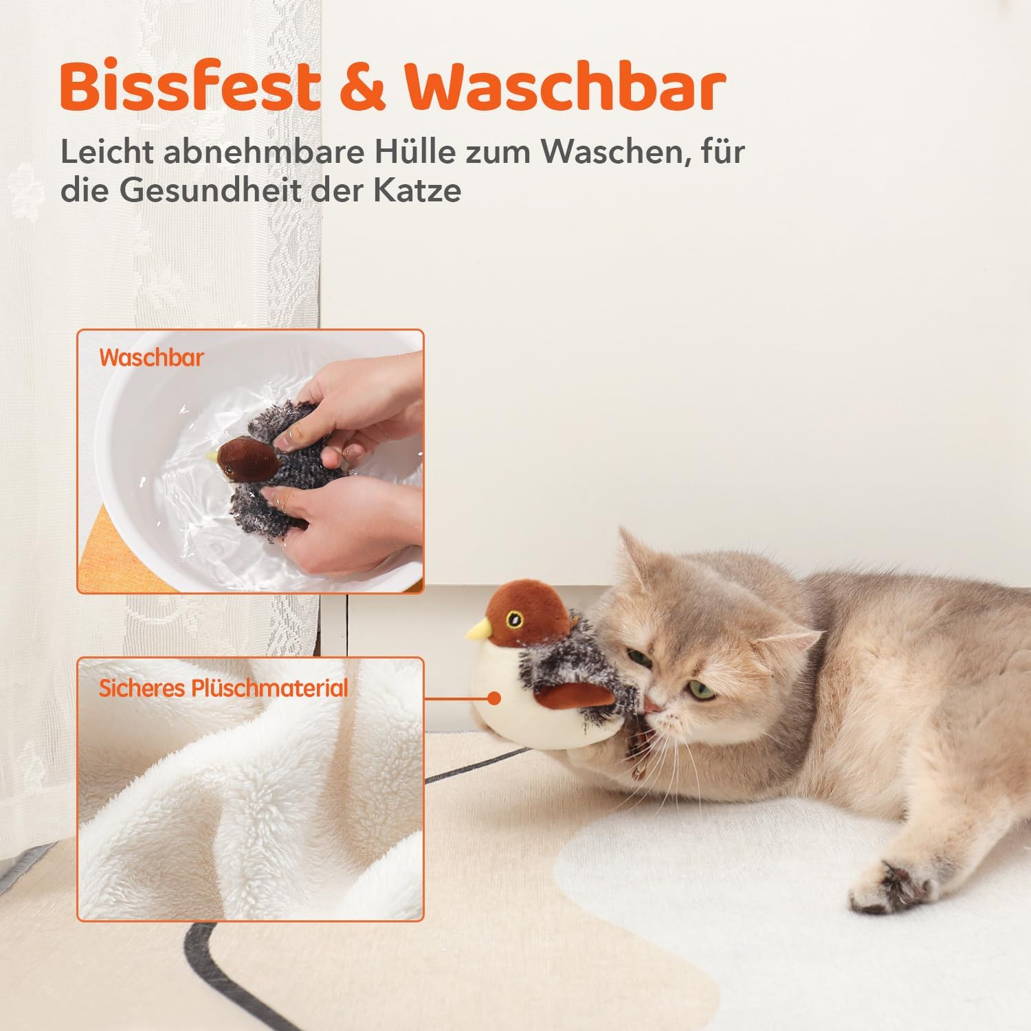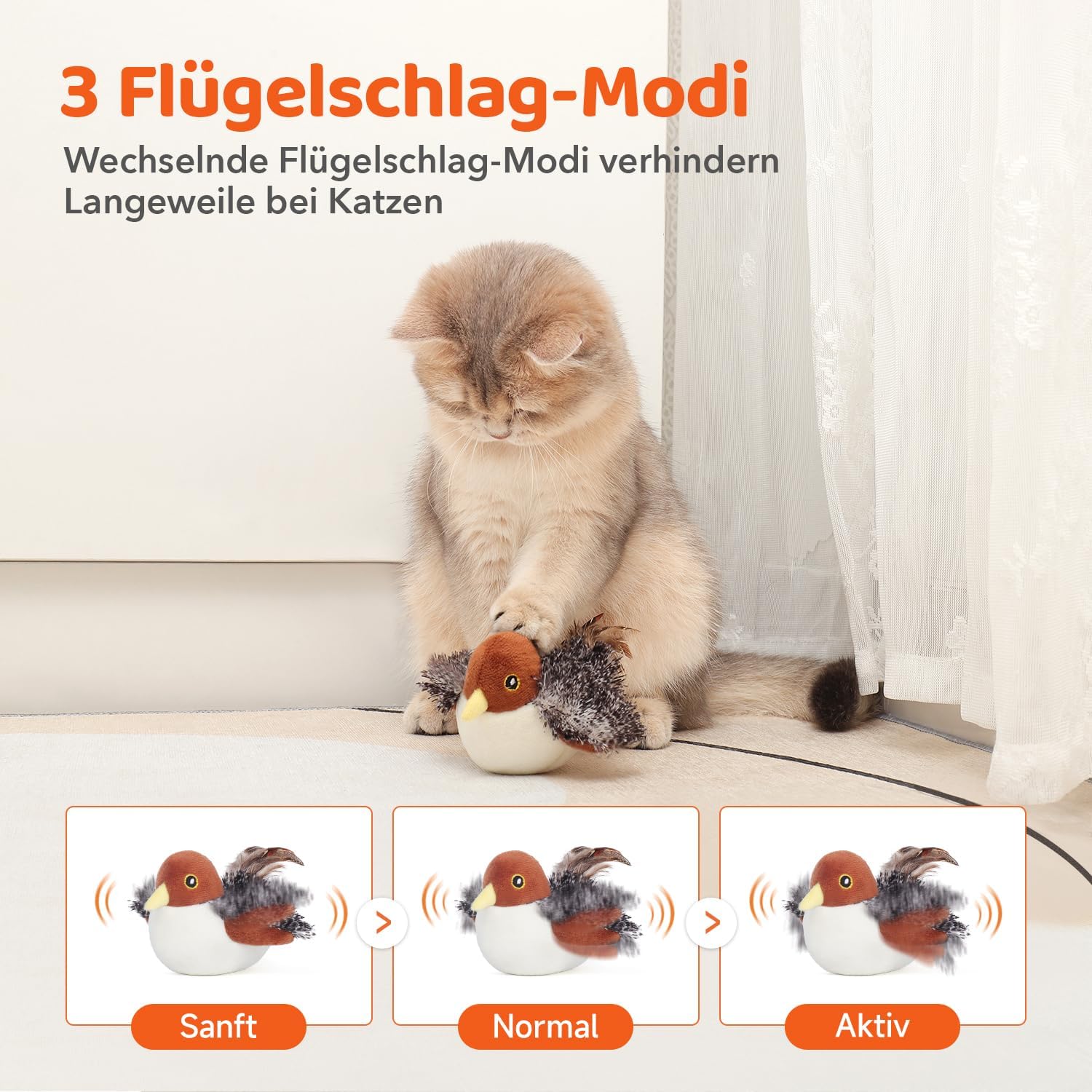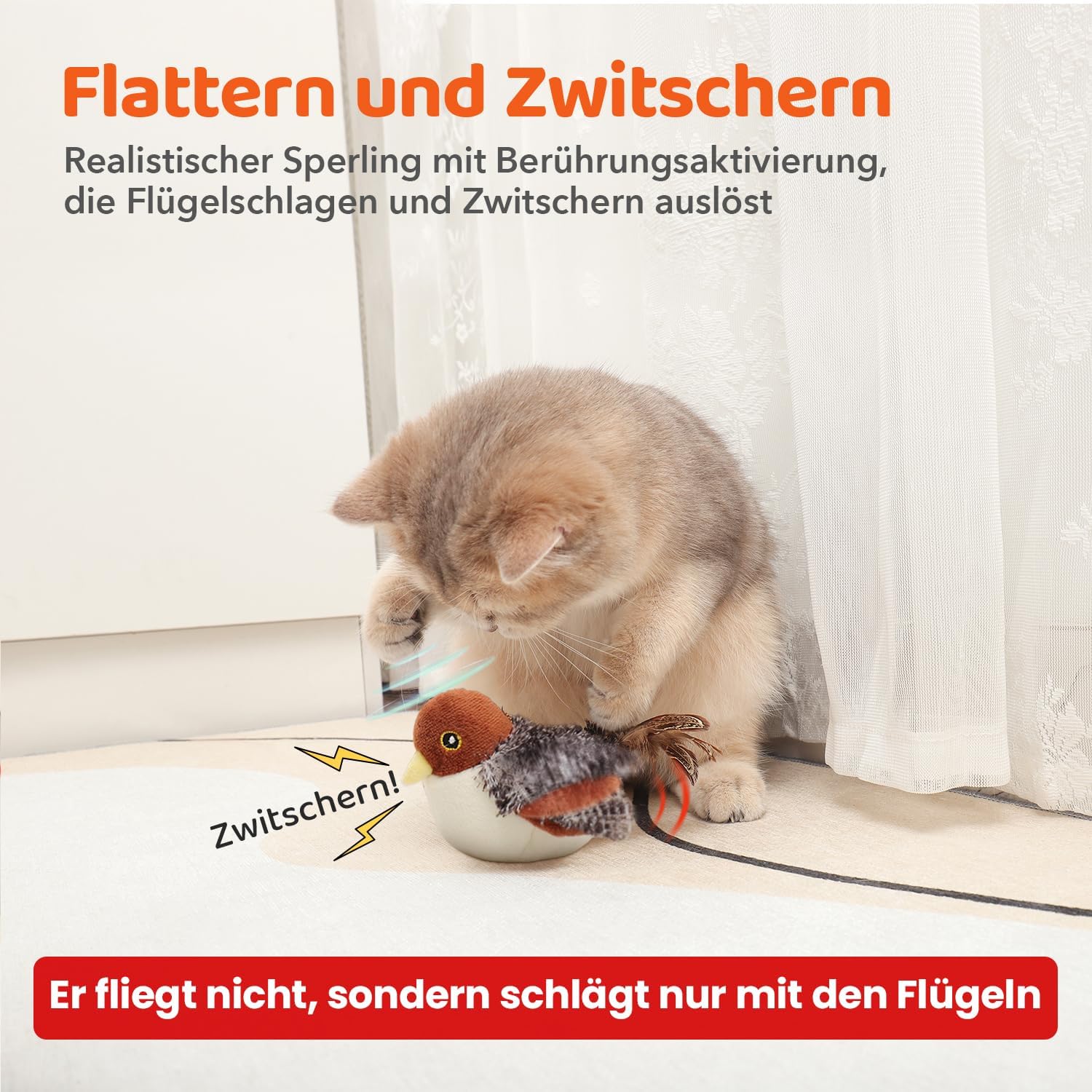 • Птица, която чурулика: Направете играта фантастична с пухкавото врабче, което издава реалистични чуруликащи звуци веднага щом започне времето за игра. Пърхащата птица събужда всеки ловен инстинкт - идеална за удари, хапане, дъвчене и лов.