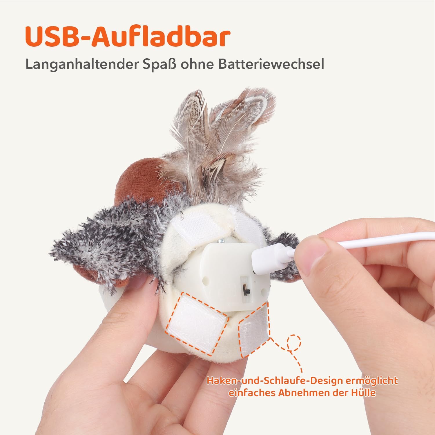 • Зарежда се през USB и е лесна за почистване: тази електрическа играчка се зарежда чрез USB - не е необходима досадна смяна на батерията. Включен е USB кабел. Механизмът за зареждане е подвижен и позволява лесно почистване на плюшената играчка. Автоматичната играчка за котки остава тиха и пести енергия, когато не се използва - идеална за дългосрочна котешка активност.