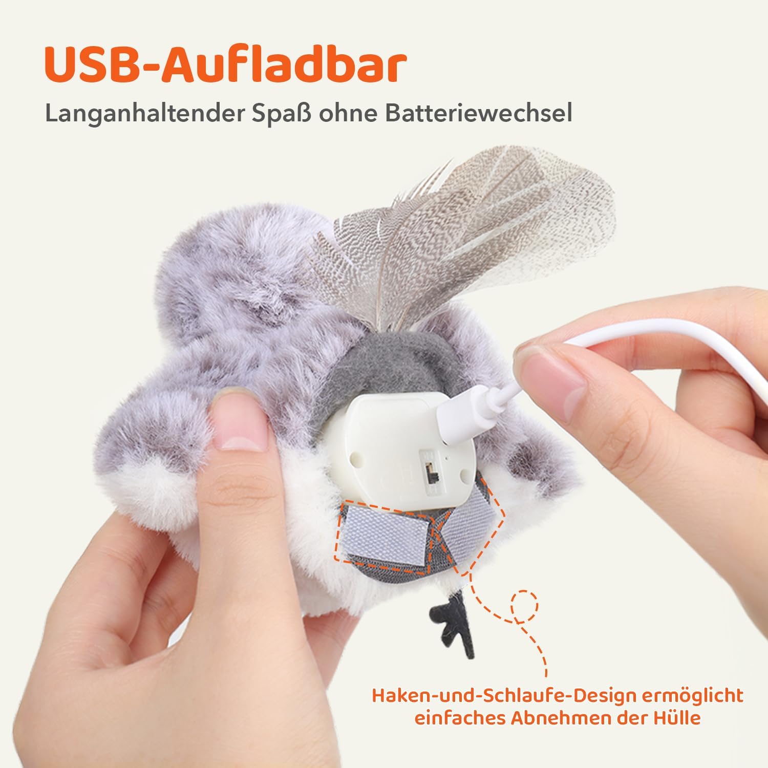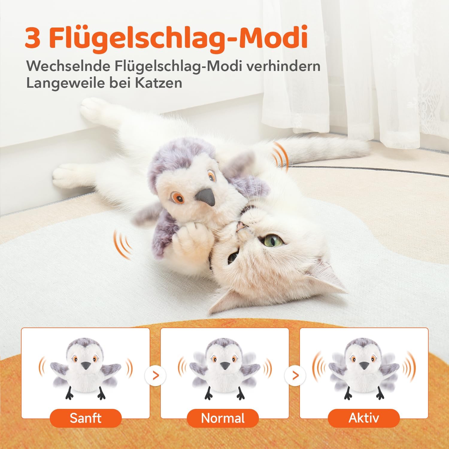 • Самостоятелна игра и забавление с движение: Тази електрическа играчка за котки реагира автоматично на допир благодарение на вградения сензор за движение. Птицата започва да пърха и да цвърчи веднага щом котката ви я бутне - като истинска летяща плячка. Това поддържа котката ви активна и забавлявана, дори когато не сте вкъщи.
